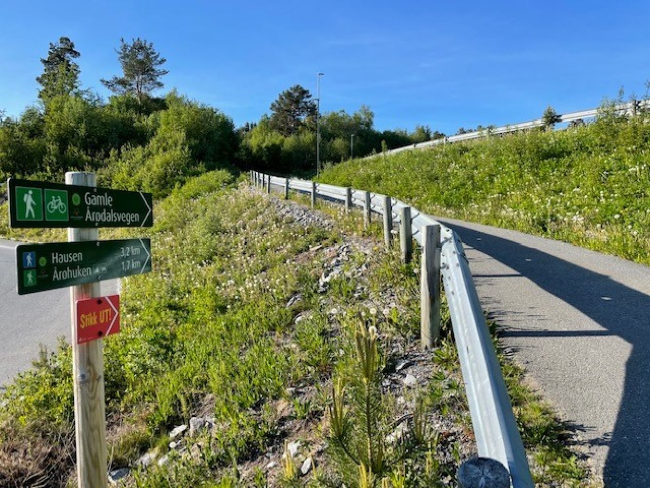 Turen starter på asfalt i den første stigningen før man går inn på grusvei. Du vil passere en bom ved starten på gamle Årødalsveien, deretter tar man til høyre og følger en grusvei ca 1,2 km, og tar av til venstre opp en stigning til Årøhuken. Turen er skiltet til Årøhuken.