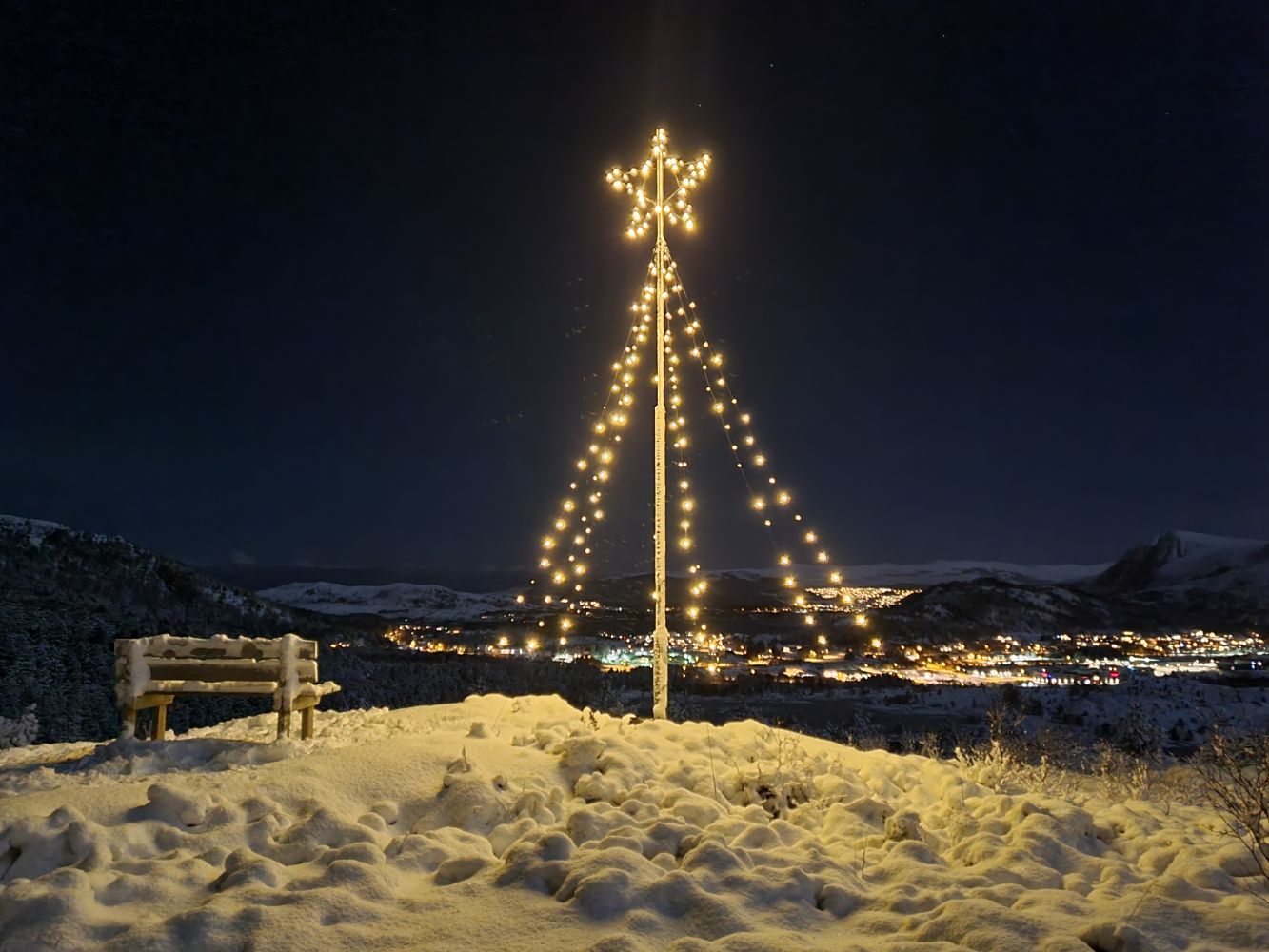 Du kan gå både med hodelykt og med truger når det er snø. 1. advent kjem juletreet opp og står til over nyttår.