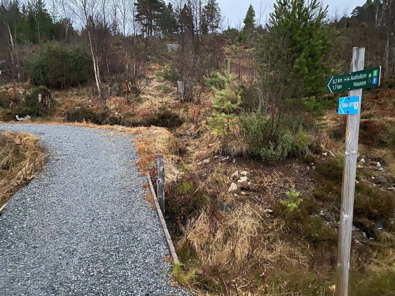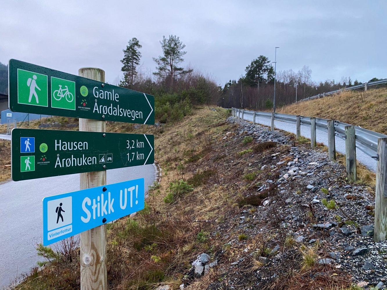 Turen starter på asfalt i den første stigningen før man går inn på grusvei. Du vil passere en bom ved starten på gamle Årødalsveien, deretter tar man til høyre og følger en grusvei ca 1,2 km, og tar av til venstre opp en stigning til Årøhuken. Turen er skiltet til Årøhuken.