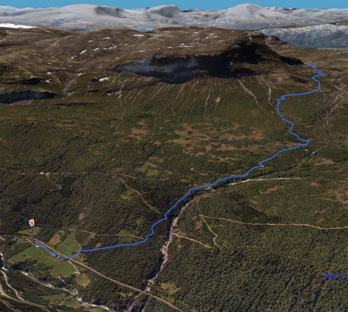 Stien følger en gammel veg som først krysser et stykke mot høyre før den går rett oppover lia, delvis sammen med den gamle rørgata fra Verma Kraftstasjon. Stien krysser en nyere veg, men følg gamlevegen rett opp gjennom skogen. Like etter at terrenget legger seg kommer en til inntaksdammen. Fortsett forbi denne og ta til høyre når en møter vegen.