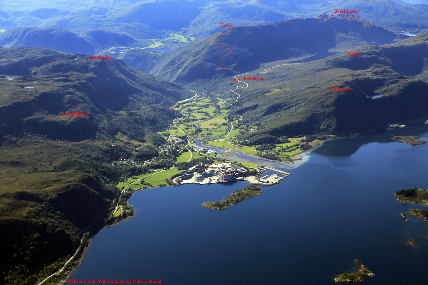 Ruta startar ved Jetmundleitet, 100 m etter den knappe svingen når ein kjem frå Åheim og har passert Kvilehytta. Det er skilta ved rutestart. Ruta er merka. Ein går først på steinbru over elva. Dreier litt mot venstre der stigninga startar. Kjem straks opp på eit lite platå som ein passerer før ein går rett opp omlag 50 m. Dreier deretter mot høgre (sørover) og går langs ein liten rygg ca. 300 m. Svingar så rett opp og dreier etter kvart til venstre før ein går opp ryggen og følger denne opp på toppen. På kartet er toppen kalla Austelidheida, men lokalt blir den kalla berre Heida. Retur samme veg. Alternativt kan ein gå mot Bekslehornet https://morotur.no/tur/Bekslehornet-rute-62. Mange går også motsett veg frå Beksle, opp til Bekslehornet, vidare langs ryggen mot Heida og ned igjen til Jetmundleitet https://morotur.no/tur/Bekslehornet-Austelidheida-Heida-rute-62
