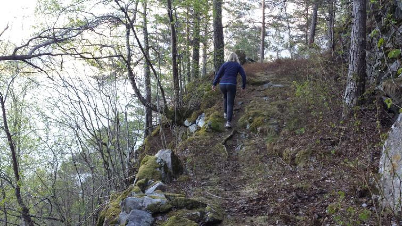 Stien fortsetter videre innover og litt ned til overkant av åker. Like før gammel steinmur tar stien opp til høyre og krysser gjennom skogen (merket). Stien går inne i skogen til en kommer til en grunn elvedal. Kryss dalen og stien fortsetter litt opp før den igjen går slakt utover på andre siden.
