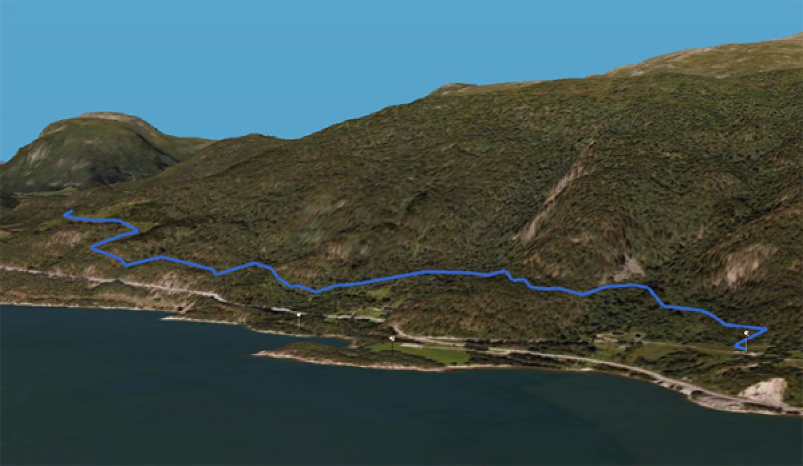 Etterhvert kommer stien til en ny elvedal, kryss over og litt oppver denne der stien går et stykke oppover før den slaker ut og krysser videre mot venstre. Etterhvert går den langs kanten av et plantefelt til en møter en traktoveg. Følg denne et stykke og hold til venstre der vegen fortsetter oppover. Hold rett fram på stien. Tydelig sti leder så ned til Nygjerdet ved Torvika.