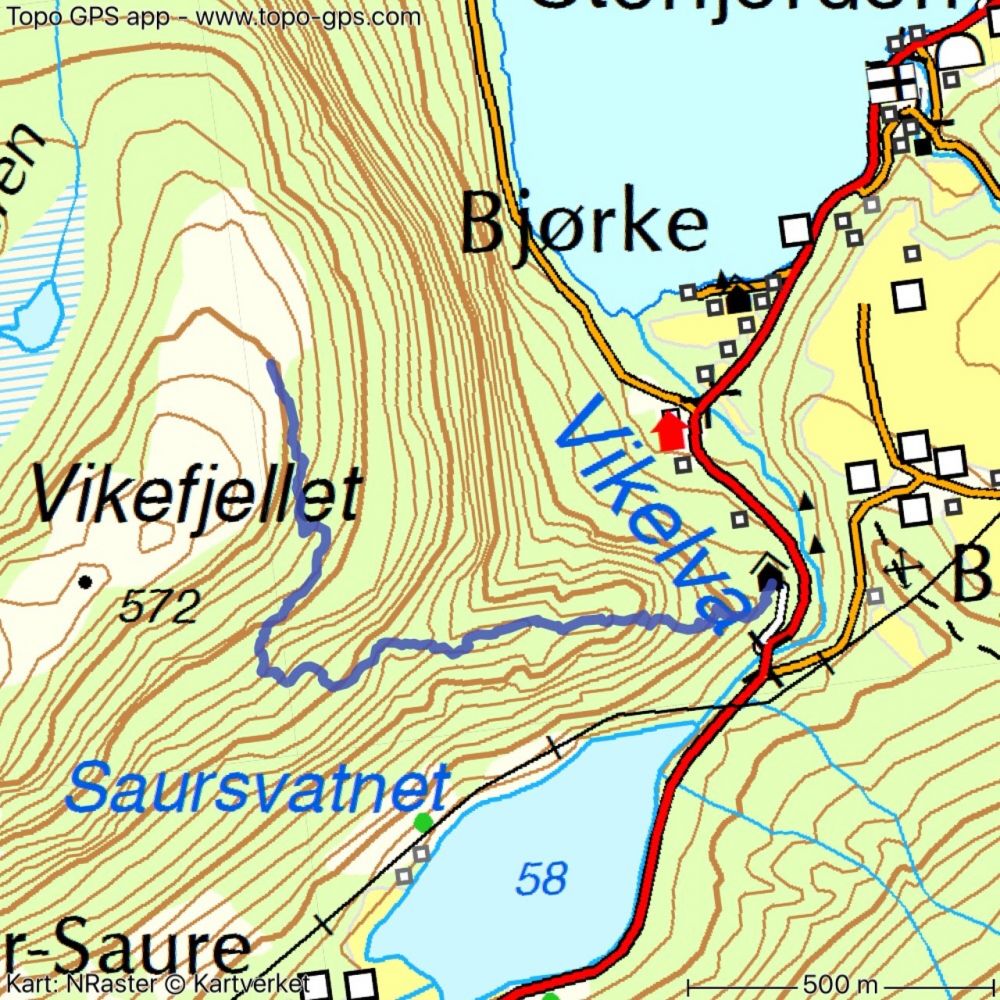 Turen startar frå parkeringsplassen til ungdomshuset Haukly, der det er god plass til parkering. Første går ein litt bratt til ein kjem opp på Haukåsen, som er eit flott utsiktspunkt mot Bjørke. Her er det vel verdt å stoppe opp for å nyte utsikta og og kanske ta nokre bilete. Vidare flatar råsa ut litt og ein går på oppsida av Saursvatnet. Etter kvart vert det litt brattare att før ein svingar mot nord og går litt slakkare mot Vikefjellet. Når ei kjem opp på Vikefjellet ( 506 m.o.h ) kan ein på nytt nyte utsikta mot Bjørke, Finnes, Kalnes og utover fjorden og mot dei stolte fjelltoppane rundt. Frå Vikefjellet kan ein returnere same vegen tilbake til Haukly, eller ein kan fortsette enten nedatt på merka sti mot Sætre og gå på grusvegen frå Sætre tilbake til Haukly eller fortsette vidare oppover på merka sti mot Oddekloven ( 972 m.o.h ). Desse turane kan ein lese meir om andre plassar på morotur.no.