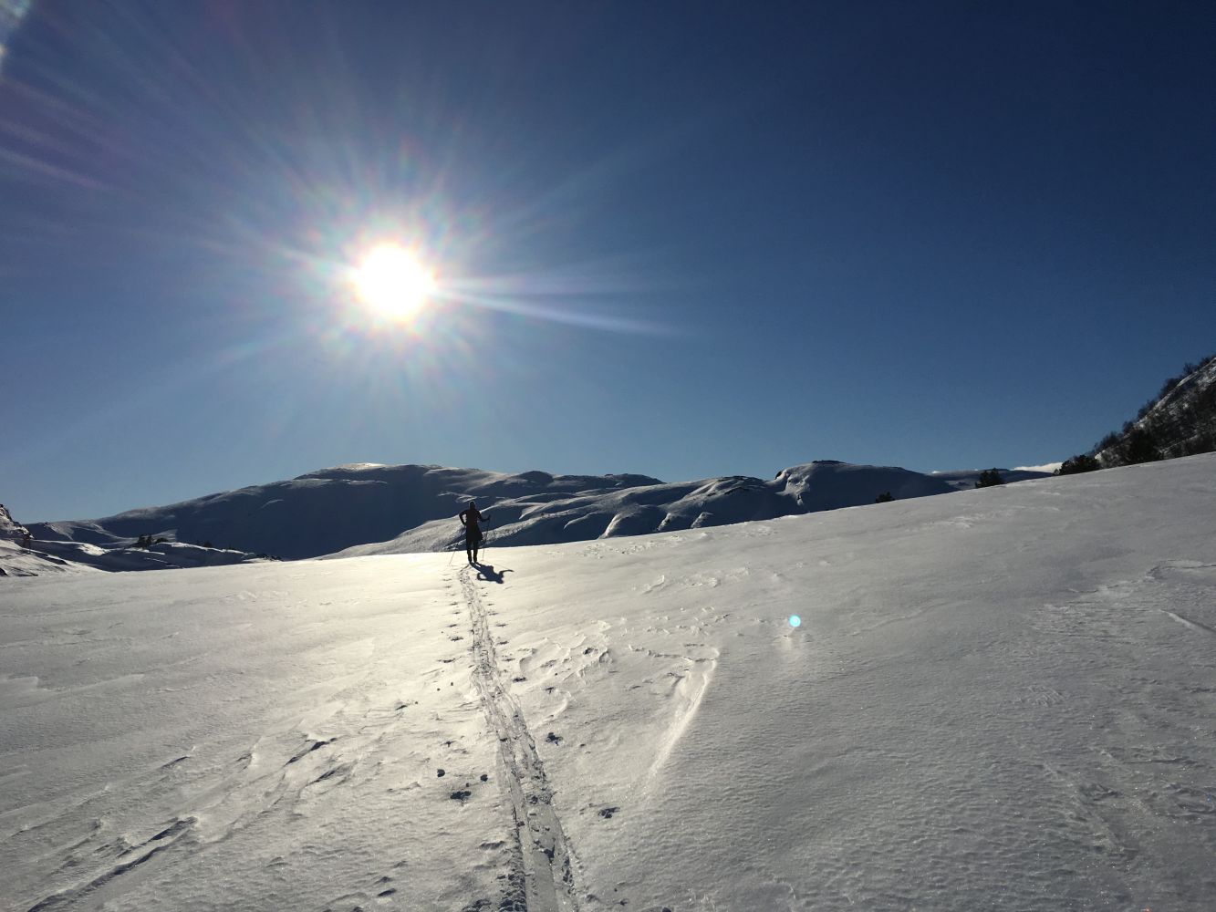 De siste heiene opp mot toppen byr på vakker utsikt, og kanskje også det beste skiføret. Her er det fint å renne ned igjen! Etter en stund skrår du mot venstre opp i Snødalen, og følger den til du kan se ned til Settemsdalen på andre siden. Gå til høyre opp ryggen, og følg denne det siste stykket mot varden. Ned igjen kan du gjerne kjøre samme vei som du kom opp, men det kan å være fint å holde litt til venstre i begynnelsen og kjøre ned en annen vei. Så lenge du kommer deg ned, kan det være artig å eksperimentere med ulike kjøreruter. Fra Ljøsvatnet følger du dine egne skispor nedover til parkeringen.