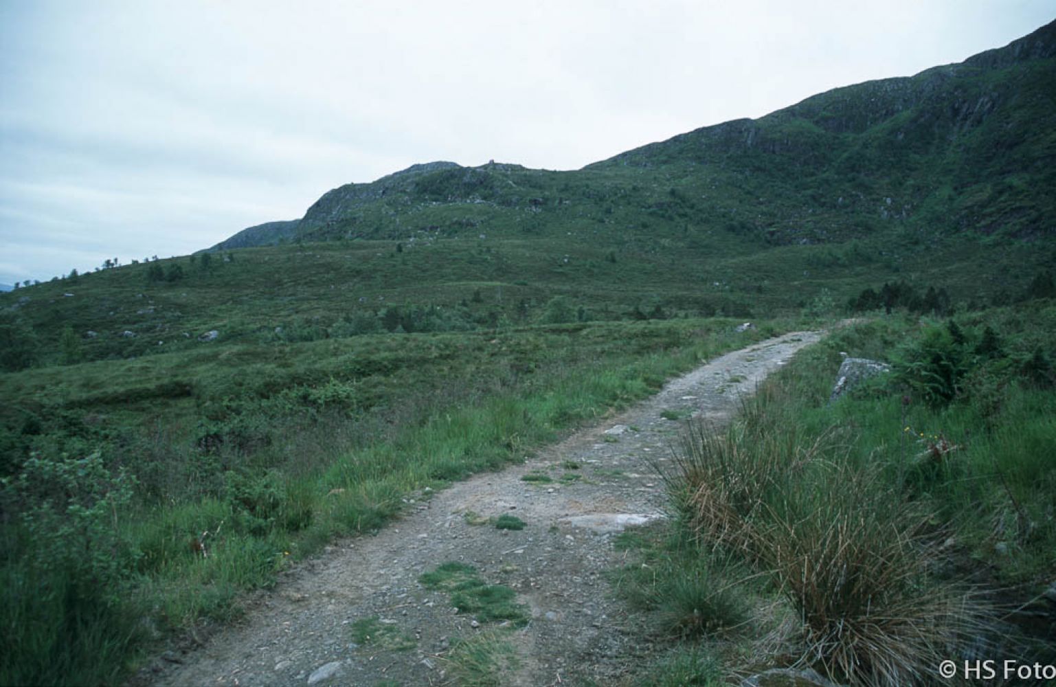 Her går man mot sør på god sti.Følg denne til du kommer til et veiskille etter ca. 150 -160 meter. Du skal IKKE følge lysmastene, men ta av mot høyre, vestover. Du er nå inne på rett sti som fortsetter opp til et nytt veiskille, like etter skiltet Mjølkeråsa. Du skal passere Mjølkeråsa, ikke ta av her, men ved krysset rett fremfor deg skal du til venstr, sydvestover. Veien til høyre tar deg med bot\rt til parkeringsplassen ved kummen. Nå er det bare å følg denne traktorveien, uten å ta av fra denne, opp til svingen der man går ut mot Blåfjellet. Stien er godt merket og skiltet helt frem.