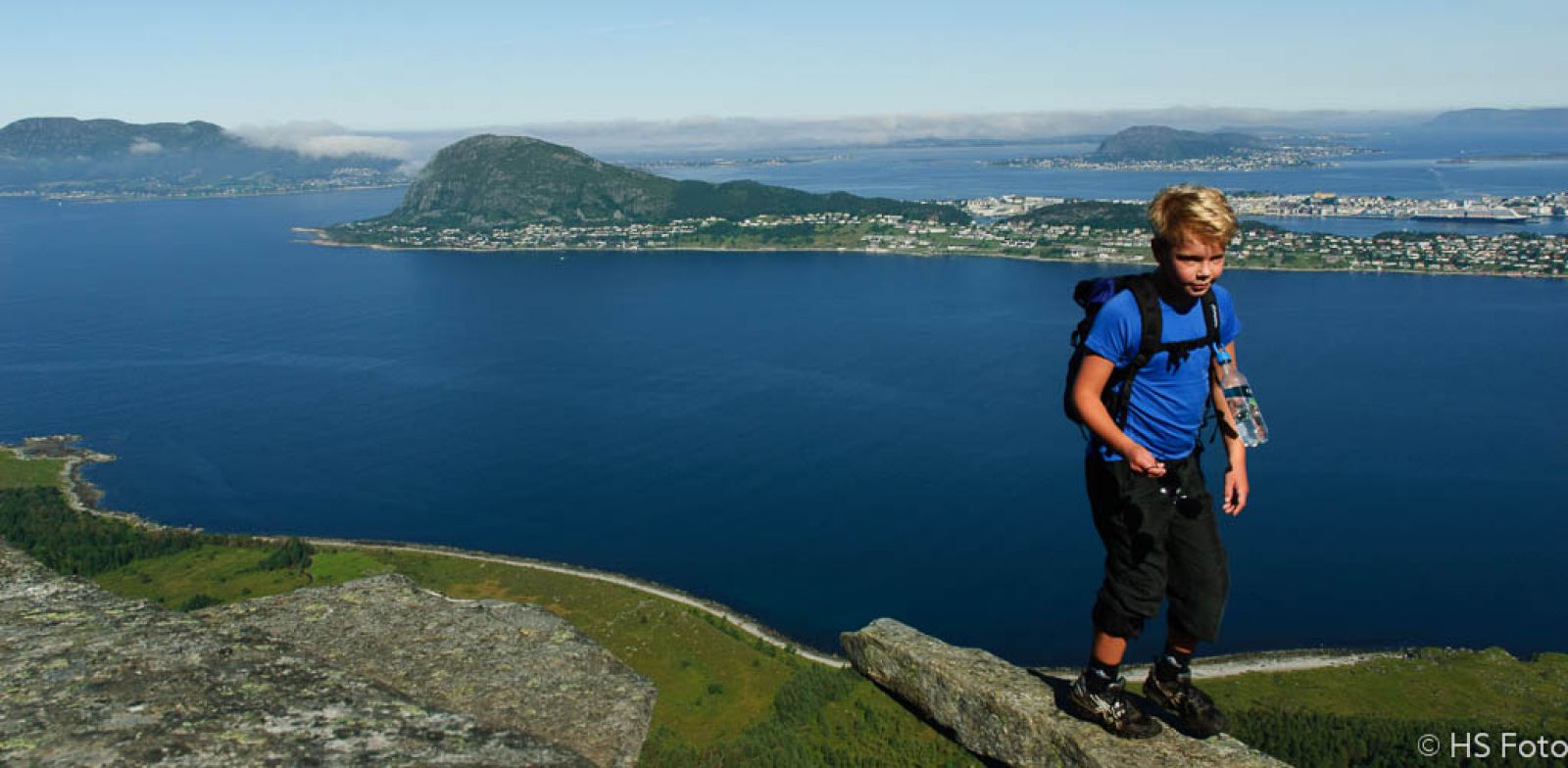 Dette er en lett og enkel tur for hele familien, om enn noe lang. Målet, Blåfjellet (344 moh), har en fantastisk utsikt ut mot havet og Ålesund i nord, samt Nordøyene. Hvis man vil kan man fortsette noen få 100meter videre oppover til VONhytta. Her er det som regel mulig å få kjøpt noen kioskvarer i helgene.Denne turen kan man gå hele året, gjerne på ski om vinteren. Lang flott utforkjøring på ski hvis du følger denne ruten.