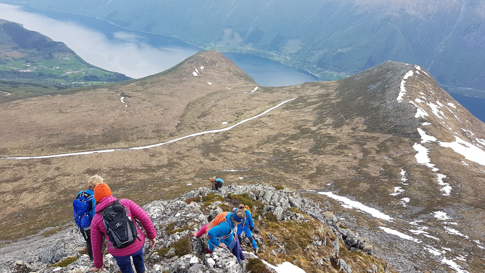 Returen går ned langs ryggen mot vest. Litt bratt nedstiging, men stien er tydeleg og god. Når du er nede frå ryggen og det ikkje lenger er sti, siktar du deg inn mot ei tydeleg langsgåande grøft. Det går ein god sti/veg langs denne grøfta og tilbake til start.
