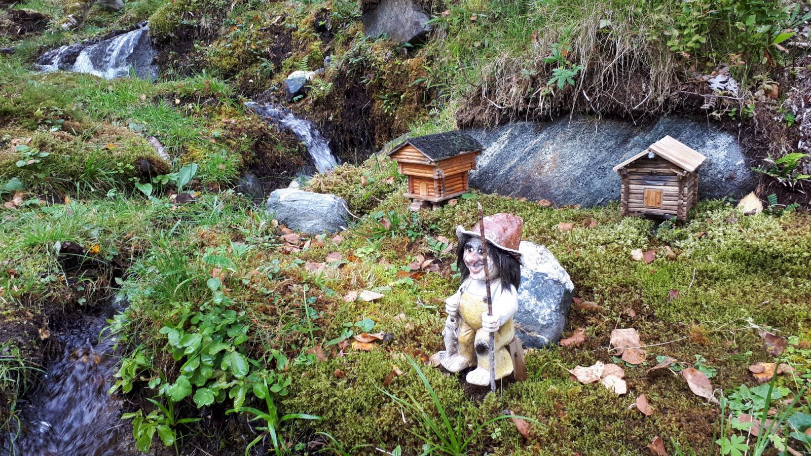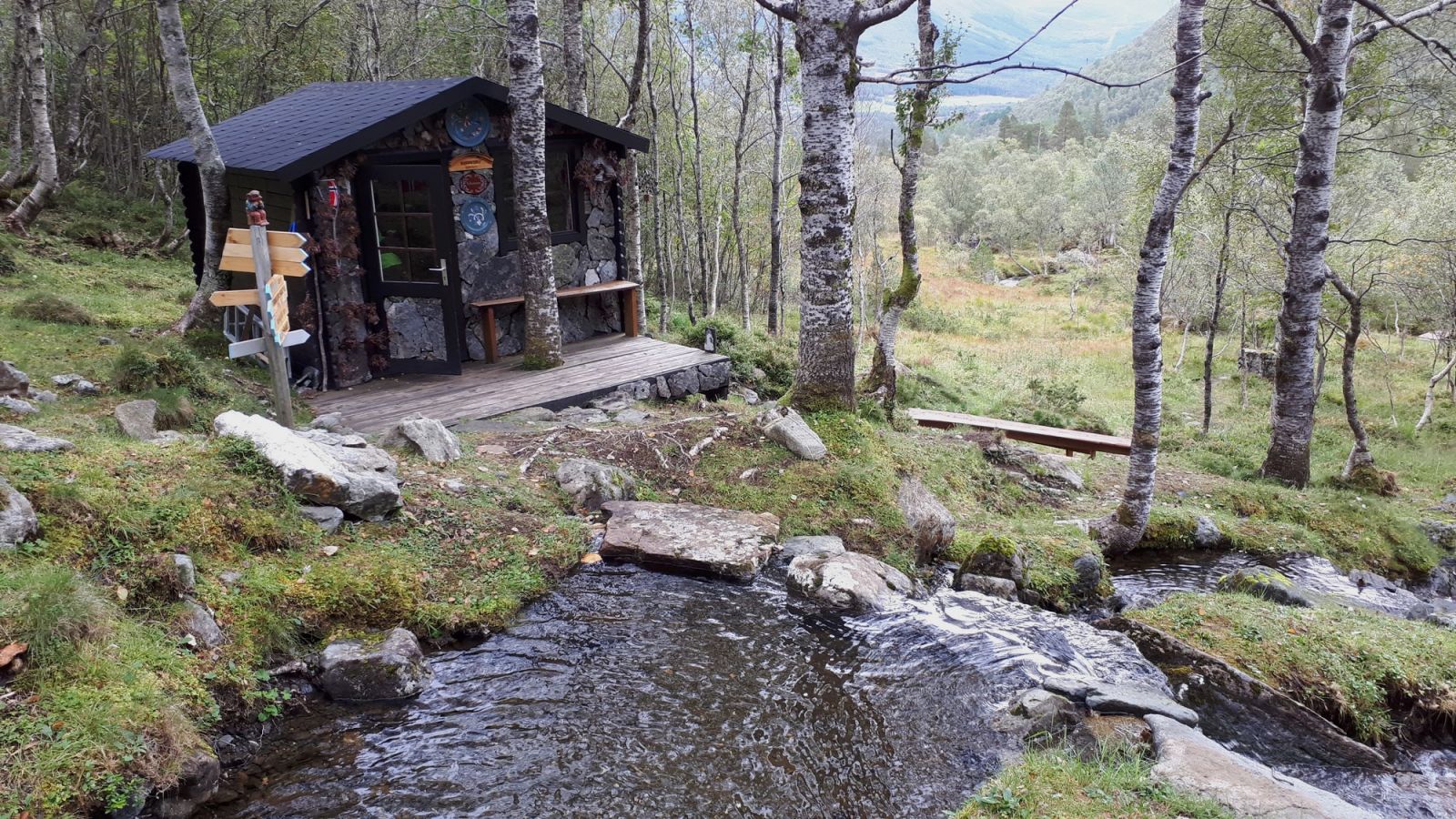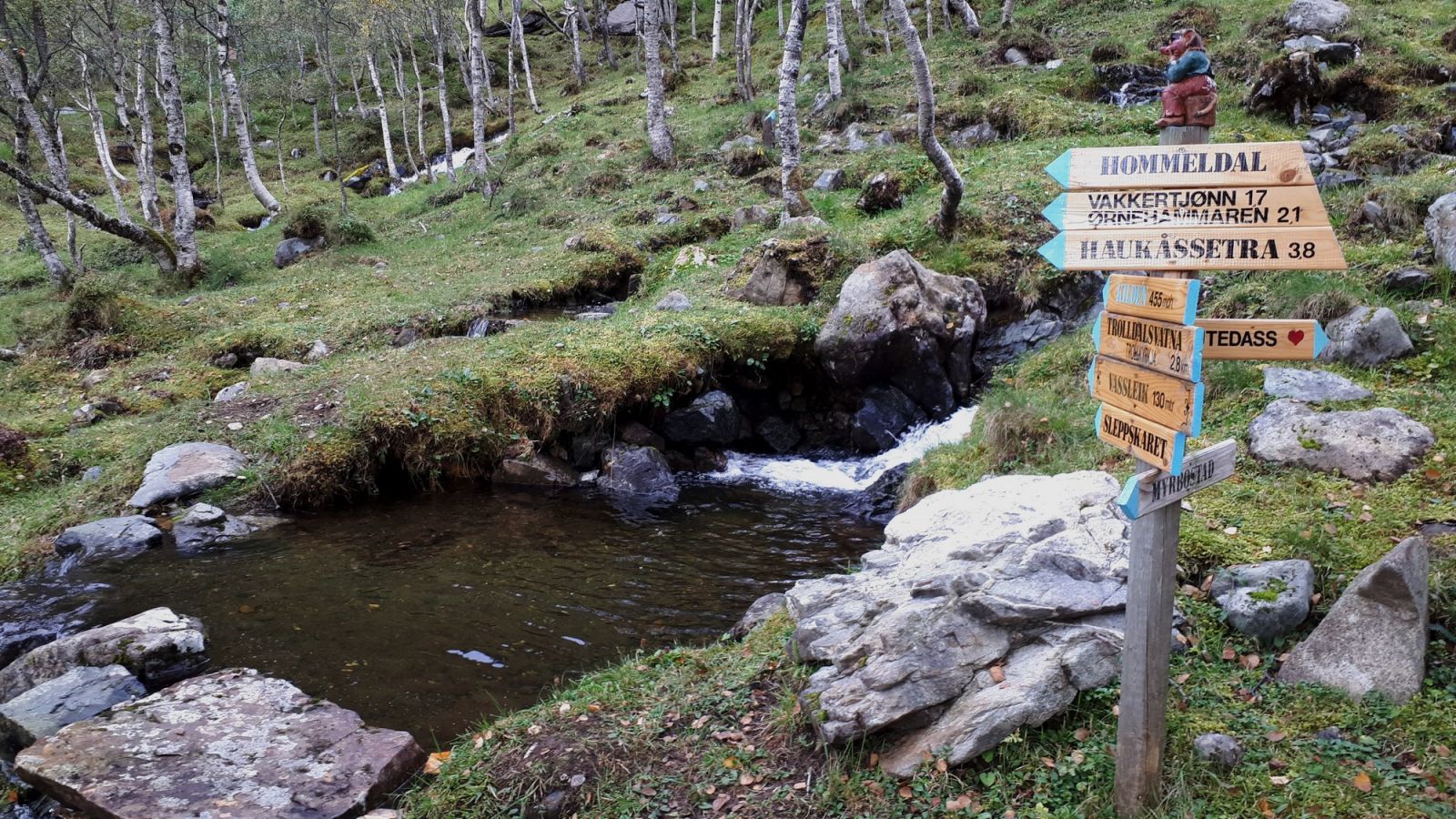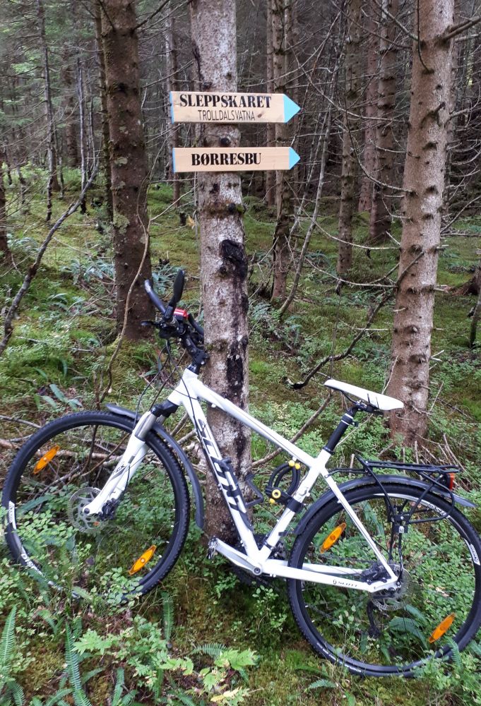 Vi parkerte ved "bommen" på Varhol, der veien innover Børresdalen går. Vi valgte sykkel de første, knappe 3 km, så vel 600 meter opp til hytta som ligger fint til i bjørkeskogen, langs merket sti. Ved hytta er det et vell av turvalg på eget skilt. Vi valgte "Sleppskaret" opp lia. I bratte partier var det både tau å holde i og små trapper. Stien til Sleppskaret følger elva, som kommer rett ut av fjellet ved "Kilden".