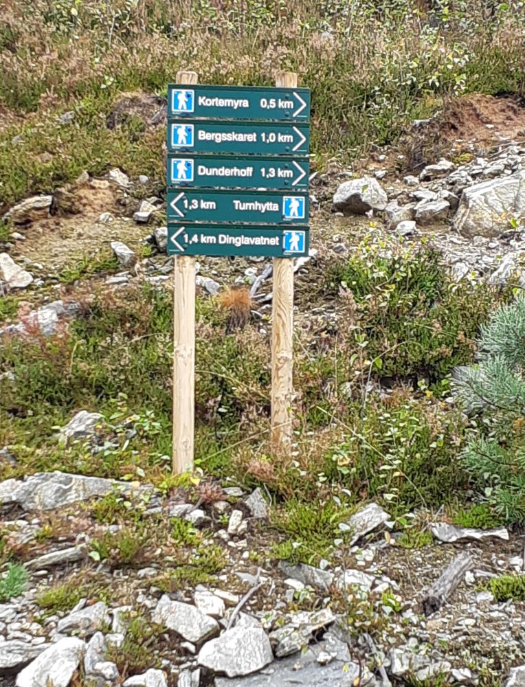 Fra parkeringsplass i Bergsvegen følger du skogsvegen vidare oppover i ca. 600 m. Ta av til venstre der vegen deler seg (følg skilt). Du ser snart Heltnelihuken. Her er det verdt å ta ein stopp og nyte utsikta. Gå skogsvegen vidare. Følg skilt til Kortemyra og Dunderhoff i svingen ovanfor Heltnelihuken. Etter 2-300 m ser du eit eldre skilt til Kortemyra. Ta av på stien her, følg raude merkepinnar. Frå Kortemyra følger du stien vidare, følg skilting til Dunderhoff. No skal du følge merka løype over til Turnhytta på svak sti. Du kan gjerne låne utedoen om du har behov. Frå Turnhytta går stien vidare opp til Dinglavatnet.