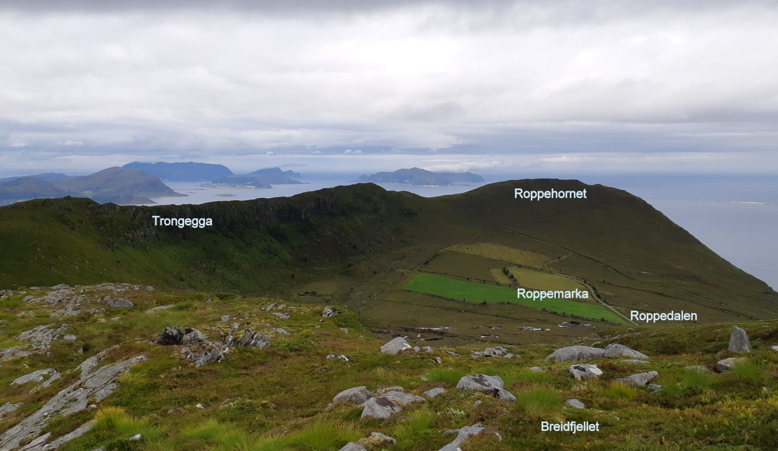 Turen startar i siste svingen før enden av grusvegen. Gå bort til elva, så finn du sti på elvebaren. Etter ca 250 m skal du krysse elva. Her er det godt merka med vardar. Følg stien vidare. Det er litt myrlendt og stien kan vere litt svak nokre plassar, men ser du deg godt om er det ikkje problem å finne den. Etter dei myrlendte områda, er det tydeleg sti heilt til topps til Breidfjellet. Frå Breidfjellet går du ned tydeleg sti i retning Roppehornet. Når du kjem ned denne sida skal du gå rett fram på Trollvassegga, ikkje følge stien til venstre. Her står nokre eldre merkepinnar som viser kvar du skal gå. Stien er tydeleg bortover Trollvassegga, som er meir ein rygg enn ei egg, og heilt bort til Roppehornet. Her går du med flott utsyn utover havet! Gi deg gjerne litt tid oppå Roppehornet. Dette er ein populær stad å sjå solnedgangen i frå.