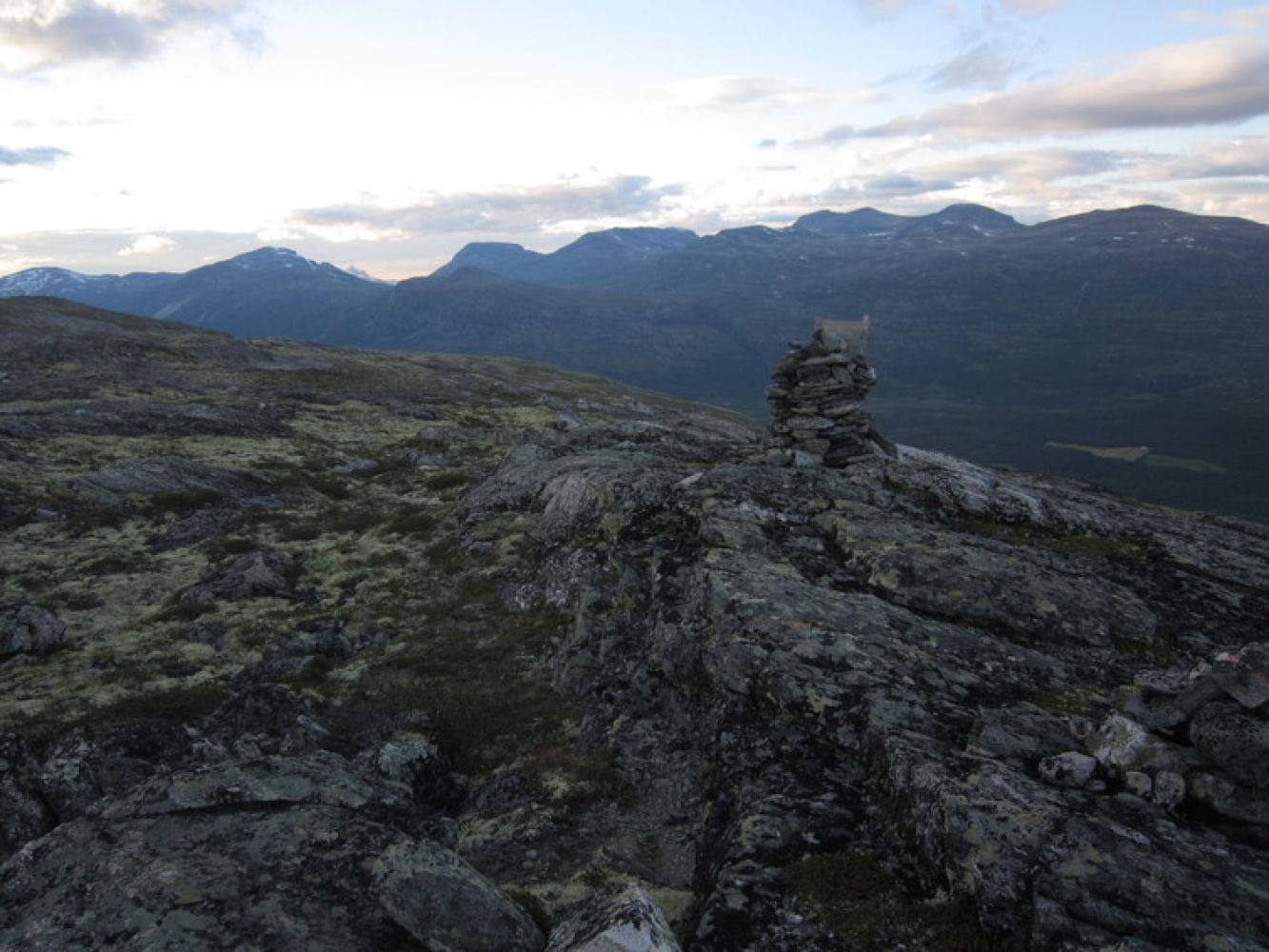 Herfra er det tydelig sti og godt vardet sti som fortsetter på skrå oppover ramper som leder mot venstre, og etterhvert under noen svaberg. Like før toppen følg vardingen litt mot høyre og deretter rett opp til toppen.