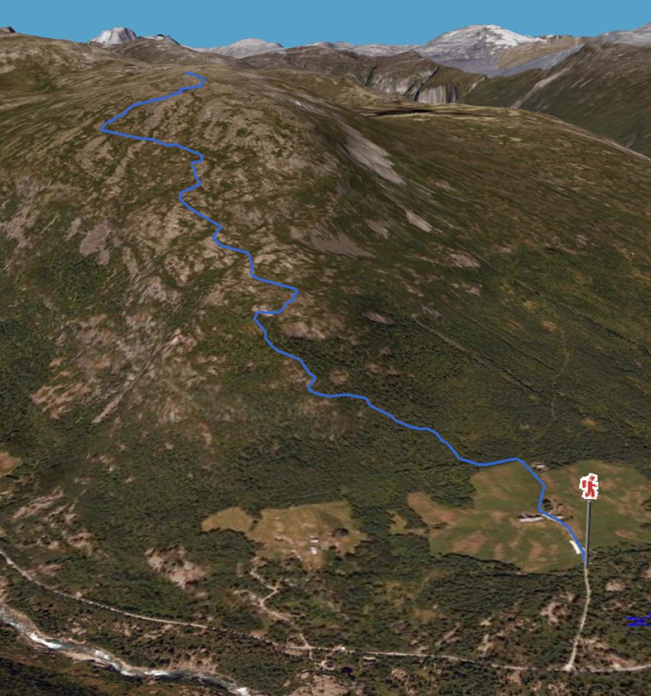Følg stien som går til venstre og rett oppover fra grinda, delvis merket på trær oppover. Stien går litt rett oppover før den krysser jevnt oppover mot venstre. Like før skoggrensa krysser den tilbake til høyre ut på en hylle (Nøsa).