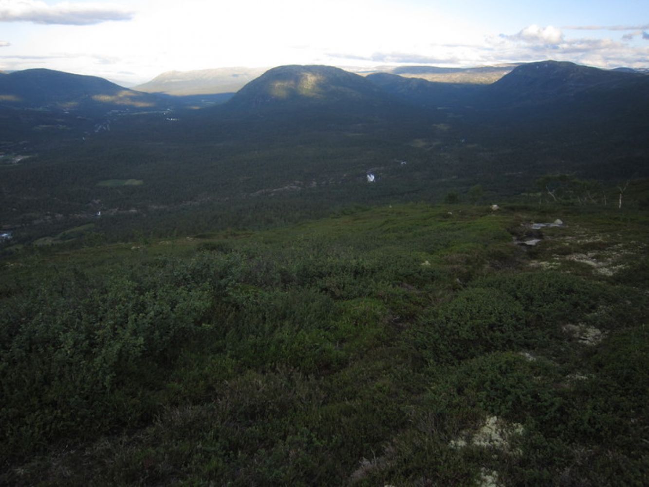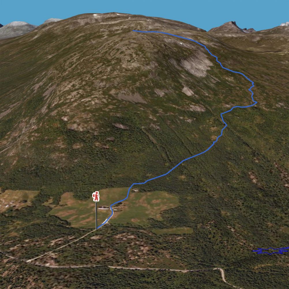 Herfra følg tydelig varding oppover, svakt mot høyre til terrenget legger seg like før toppen. Følg deretter ryggen sørover bort til toppen.
