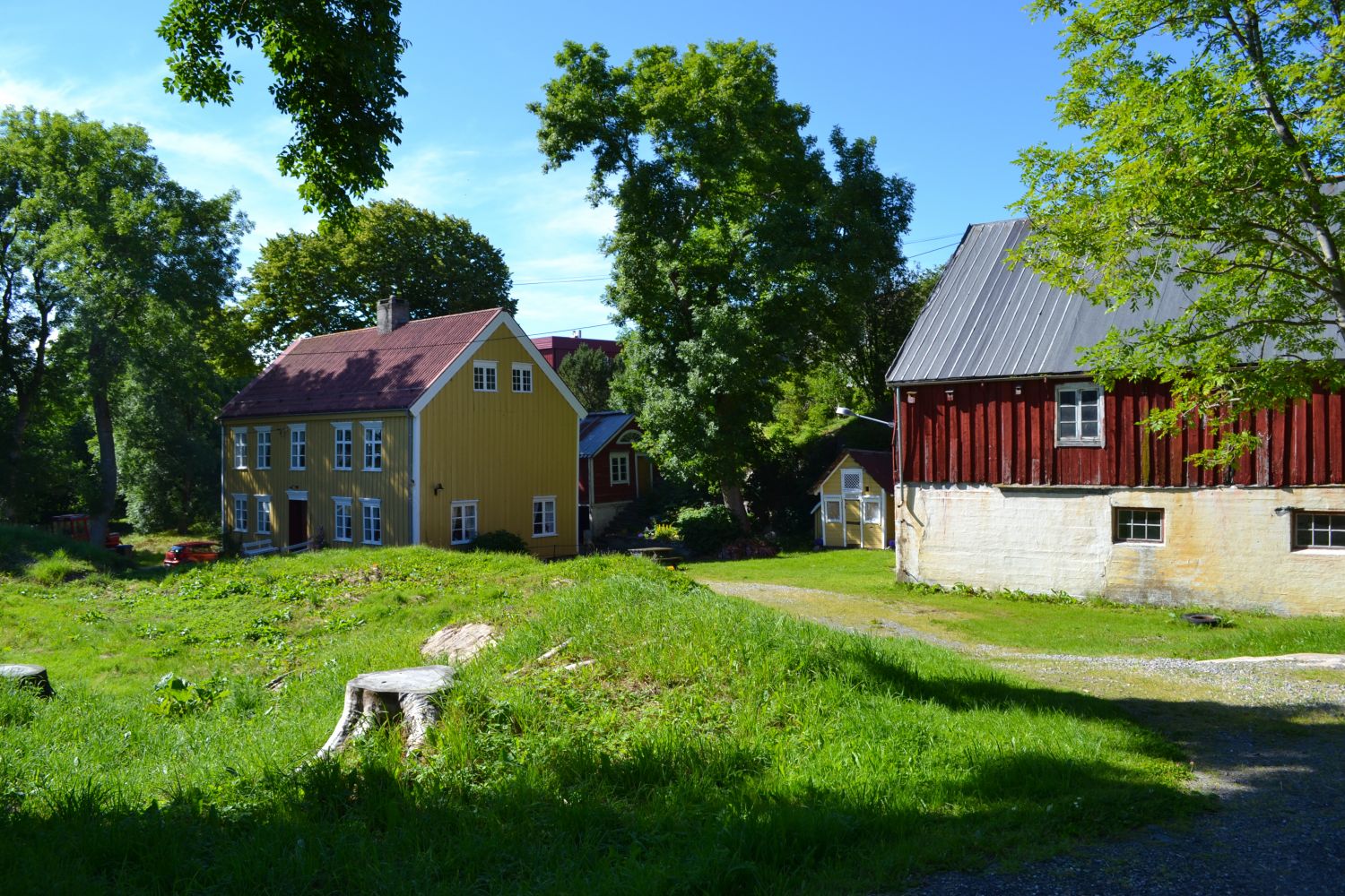 Følg grusveien videre mot det gule våningshuset på Dalen gård.