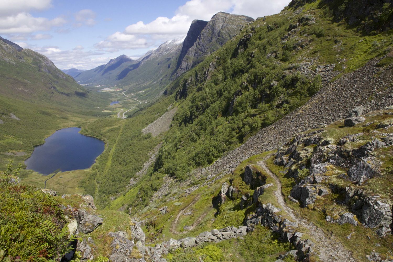 Frå parkeringa i Herdalen går du langs ein grusa turveg forbi eit stort skilt merka «Den Trondhjemske postvei». Etter rundt 150 til 200 meter svinger råsa til venstre, og då er du inne på den opphavelege postvegen. Om du snur deg og ser mot nord, vil du sjå omrisset av den gamle postvegen innover Strandadalen. Følg vegen inn til og forbi Herdalsvatnet/Brekkevatnet. Du vil sjå at det langs råsa går av små snarvegar og andre råser, men vi held oss på den orginale råsa til postvegen. Langs råsa vil du etterkvart sjå restar etter anleggsbrakkar og ein påbyrja riksveg planlagd over til Sykkylven frå 1930-talet. No byrjar det etterkvart å bratne litt til, men postvegen slynger seg no elegant oppover fjellsida i serpentinarar heile vegen opp til Kremmarvatnet. Her må du ta ein avstikkar på råsa som går ut til venstre ved Kremmervatnet, det er obligatorisk. På kjøpet får du då nyte ei framifrå utsikt inn Geirangerfjorden som også er verdsarvområde. Gå deretter tilbake til Kremmarvatnet, og fortsett på postvegen langs eit nytt vatn 739 meter over havet og rundt Sætrenibba til du kjem til Ljøsætra. Her følger du råsa heile vegen ned til fylkesvegen. Mellom Ljøsætra og riksvegen står tørrsteinsmurar frå det påbyrja vegprosjektet.
