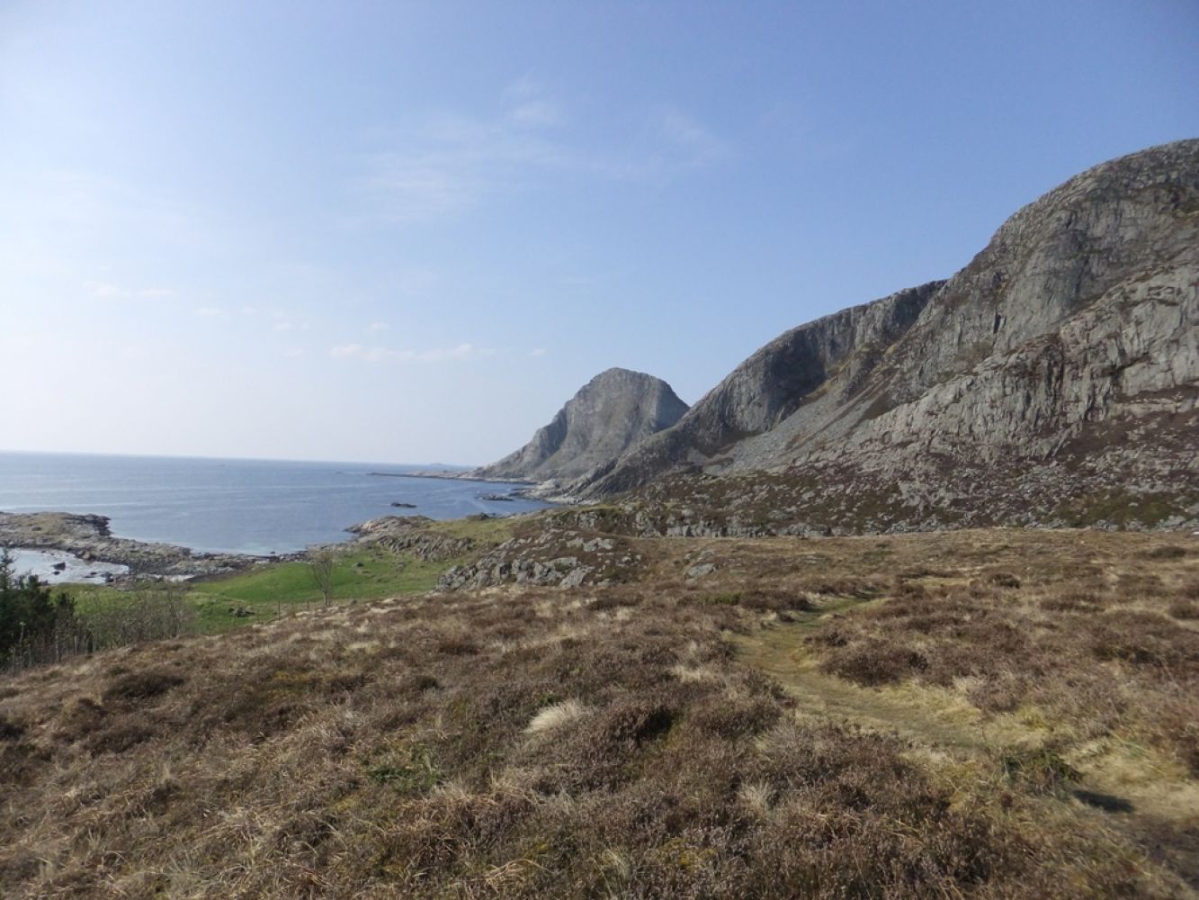 Den merka stien starter på høgre side av grusvegen, omlag 100m etter skiltet på Skarshaugen. Stien følgjer stort sett fjøra, men går over nokre kliprer og fjellnaser. Stien er godt merka med merkepinner og skilt. Stadar og attraksjonar ein treff på: 0,36 km eit gjerde, husk å late att grinda. 0,65 km Kalvågane 0,97 km Storegjøtten og Lisjegjøtten 1,07 km Grytevika 1,19 km Flatmagevika og Sandgjøtten 1,40 km Breidvika, ned mot Breidvika er det litt bratt og her kan det vere glatt. 1,87 km turbok Sandsøy IL, her krysser rute 2 som går frå Hellandsvågane, nord for Dollsteinen.2,20 km Dollsteinhola, siste 150m er det ein bratt, men fullt farbar signing opp til holeopninga