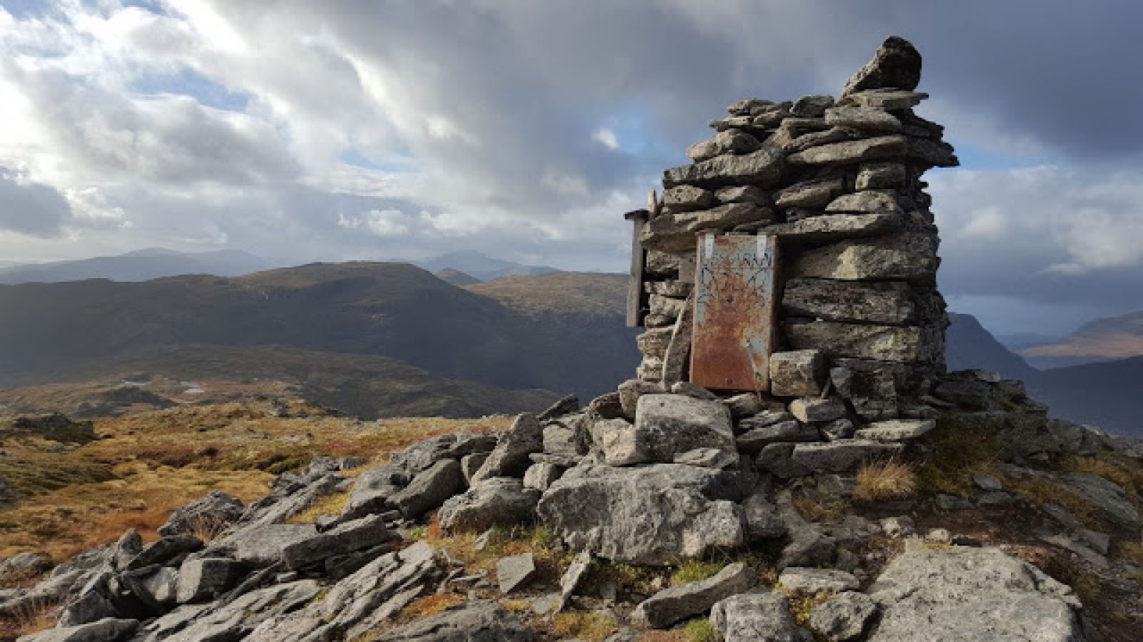 Tur med fin utsikt både utover havet og innover fjella på Nordmøre og i Romsdal. Varde på toppen av Duå.