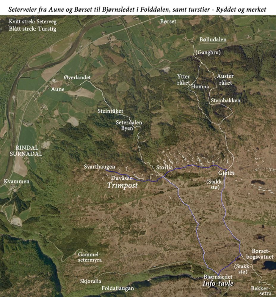 B. Et alternativ er å følge merket sti som starter rett over veien for infotavla og går i slakt myrterreng opp til Gjøtet. Herfra vestover langs ryggen til toppen av Duvåsen. Ca 0,9 km lengre enn alternativ A. Det anbefales å ta turen fra trimboksen ned til Svarthaugen. Flott utsikt oppover bygda og nedover Surnadalen.