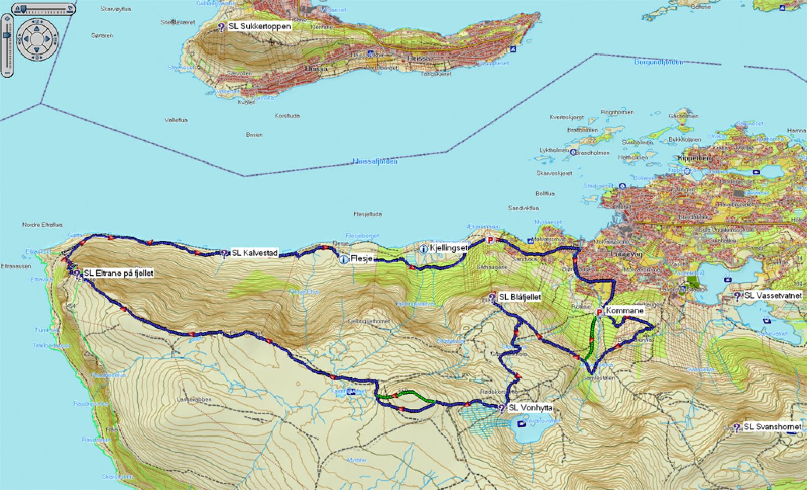 Vi starter rolig fra Sandvika og følger bilvei til kommane. Følg 'Molværsvegen' til den krysser 'Legane'. Her tar man til høyre opp 'Legane' til denne krysser 'Molværsbrauta'. Denne veien følger man opp til kommane. Fra denne parkeingsplassen krysser man en liten bro over elva, og går stien rett opp, til en treffer på hovedstien fra LIL-tun(Langevåg Idrettslag). Herfra noen hundre meter østover, mot telefonlinken og inn på hovedstien fra LIL. Dette gjør turen noe lengre, men mer 'start' vennlig. Det er noen benker langs veien, samt at man passerer en veldig flott bro. Denne er basert på 'Bukkene Bruse', trollet holder broen oppe, og de tre bukkene Bruse står oppstilt langs broa. Figurene er utskjært av tre, og de største er mannshøye. Veien videre fra broen sier seg selv. En tur ut på Blåfjellet (344 m.o.h.)er anbefalt, gir en god utsikt over Langevåg og Ålesund med øyene rundt. Veien går videre opp til VONhytta, herfra er det slutt på vei og over på sti. Selve starten på stien mot Eltrane kan være vanskelig å se, men det går et tråkk rett bak VONhytta mot vest, det er bare å sikte på det høyeste punktet i 'himmelsjå' og gå på! Man trenger ikke stier her oppe på fjellet, det er flatt og fint og du går like fort i terrenget som på stiene. Turen vider ut til Eltrane er tydelig, med noen varder her og der. Vel ute på Eltrane så har du en luftig utsikt! Det er ikke mange turer som slår denne turen når det gjelder utsyn. Selve turen ned fra Eltraneset er krevende. Det er bratt, glatt og sleipt i gresset. Man kan snu og gå samme vei tilbake, evt. kan man gå mot sør, over 'Langerabben' (590 m.o.h.) og tilbake til VONhytta og videre ned til bilen.For de som fortsetter, så er dette som sagt en bratt skråning med klyving. Ved enkelte områder er det lite og gripe tak i. Når en først er nede, er det lett terreng tilbake til bilen i Sandvika. Se informasjon om kulturminnene du vil passerer. Dataene er lagret i GPS-sporet slik at du kan lese om det når du kommer frem til disse punktene. Det er også tavler med informasjon vedrørende kulturminnene på den enkelte plass. Da er det bare og ønske dere god tur, om det bare er ut til Eltraneset evt. Eltrane på fjellet, eller om dere tar hele turen!