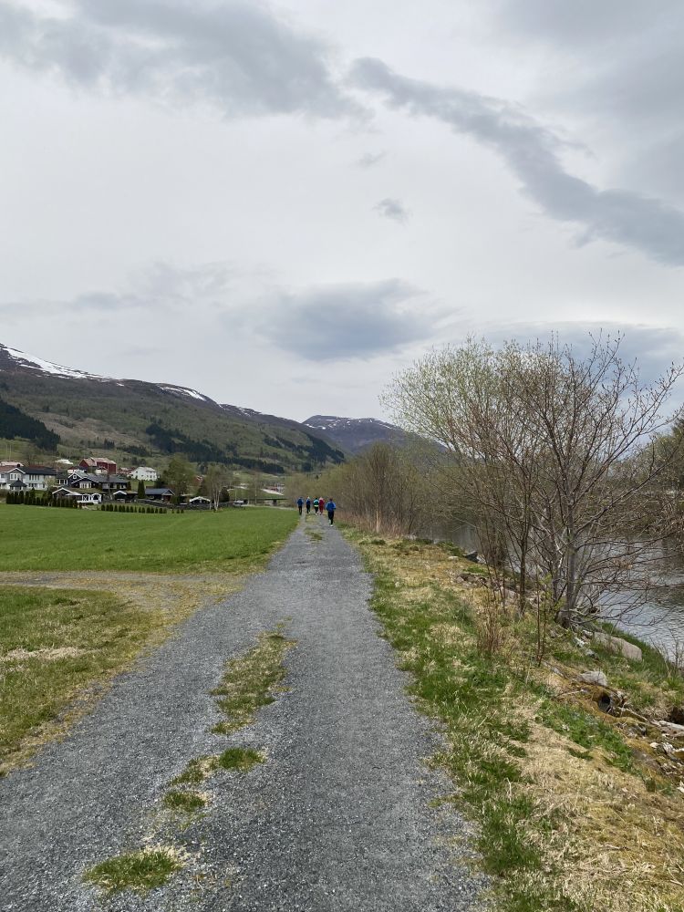 Fra parkeringa ved kommunehuset går du forbi innhegningene og mot gamlebrua. Ta til venstre før du kommer til gamlebrua. Følg grusvegen helt opp til lysfabrikken. Her går vegen over til traktorveg/sti mellom elva og jordet. Etter ca 2 km kommer du til rampen, hvor det er mulighet å fiske i elva. Her er også stikkut registreringa. Etter 3,5 km går stien over brua, tar til høyre med en gang du er over brua. Følg stien langs elva helt til du kommer tilbake til Gamlebrua, hvor turen startet.