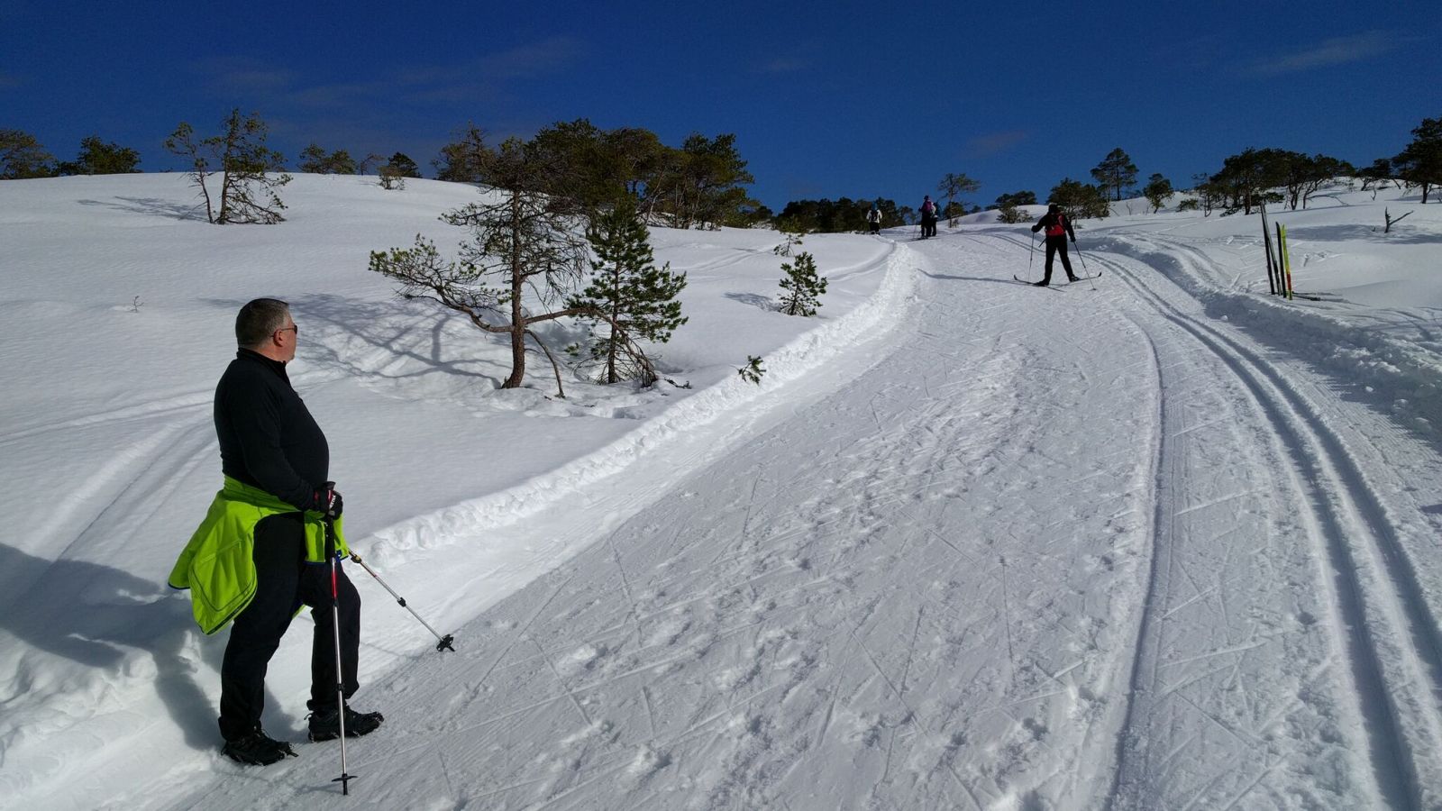 Du er rett i de oppkjørte løypene når du går av stolheisen, på toppen av Høgelia. Tar du til høyre (vestover) havner du i alpinbakken, som fører deg ned til parkeringsplassen.Skal du innover fjellet må du ta til venstre, mot øst. -------- Det går greit med langrenns-ski skal du følge denne oppkjørte løypa. Det anbefales imidlertid fjellski med stålkanter hvis du skal svinge bortom Høgkubben eller for eksempel Geitnausa. Også nedfarten går enklere med stålkanter da underlaget kan bli nokså hardt utover ettermiddag og kveld.-------- Det er ingen stidelinger på vår rute, med unntak av ett kryss etter ca. 3,8 kilometer. Da går det en hårnålssving mot nordøst. Denne tar deg nordover mot Geitnausa og Bigtonløypa. Vi fortsetter mot øst en kilometer til, og opp til Heiane. Vel oppe på Heiane tar vi en velfortjent pause. Det er flott utsikt her, kun sperret av Geitnausa, mot nordvest. Det er dette stykket opp/ned fra Heiane som er det bratteste på denne turen. Returen går den første kilometeren i de samme spora vi kom i, til krysset. Her tar vi nå til høyre, mot nord, og følger en godt merket løype. Denne stien går i en sløyfe rundt Høgstølvatnet. Etter ca. 1200 meter kommer vi til et skilt som peker mot Geitnausa og Bigtonhytta. Dette er merking som tilhører barmark-stiene. Vi står nå på toppen av Bigtonløypa, og det er nå så å si kun unnabakker helt ned til parkeringsplassen, med unntak av to myrområder som vi skal krysse. Det er brede fine tråkk hele veien, og det er ingen partier nedover som er brattere enn 11 grader. NB: Hele ruten, innkluert heisa er på 11,2 kilometer. Selve skituren er på 10,2 kilometer.