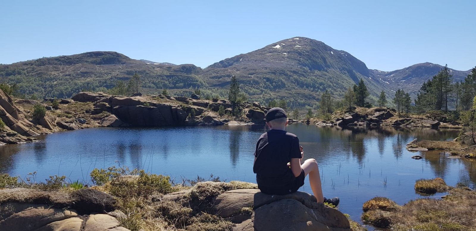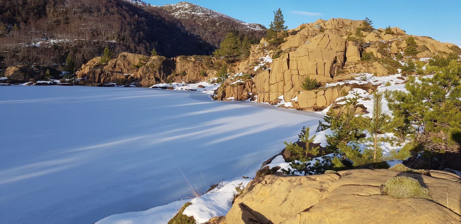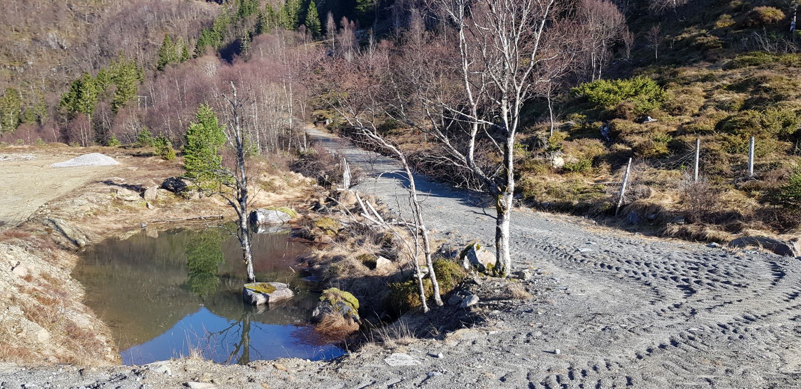 Frå parkeringa kryssar du vegen og går opp langs bruddet. Her har vore utført noko arbeid, men det er godt merka gjennom bruddet. Følg traktorvegen som går vidare opp mot Helgehornsvatnet. Framme ved vatnet tek du til høgre før du følge merkinga og går ut i terrenget til venstre mot Eurekavatnet.