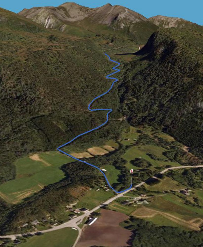 Fortsett forbi huset og fram til et jorde. På andre siden av jordet starter stigningen. Vegen slynger seg i svinger oppover fjelldalen. Litt bratt midtparti, før det legger seg siste stykket inn til Skarvatnet.