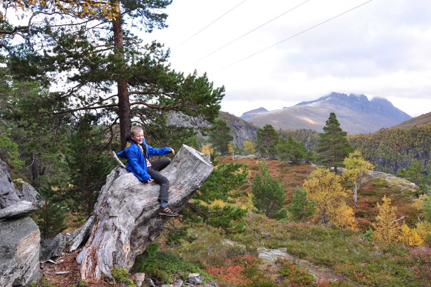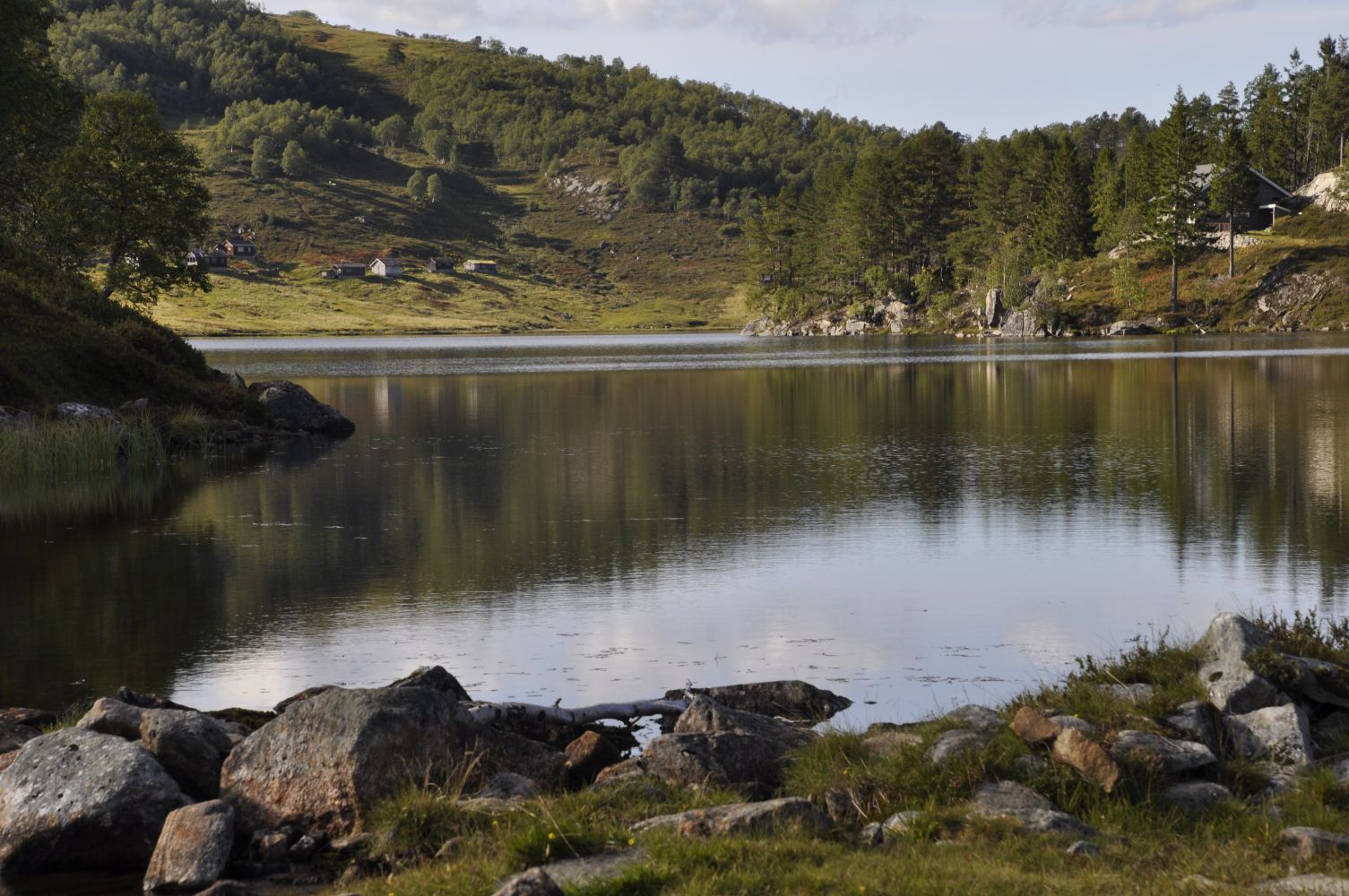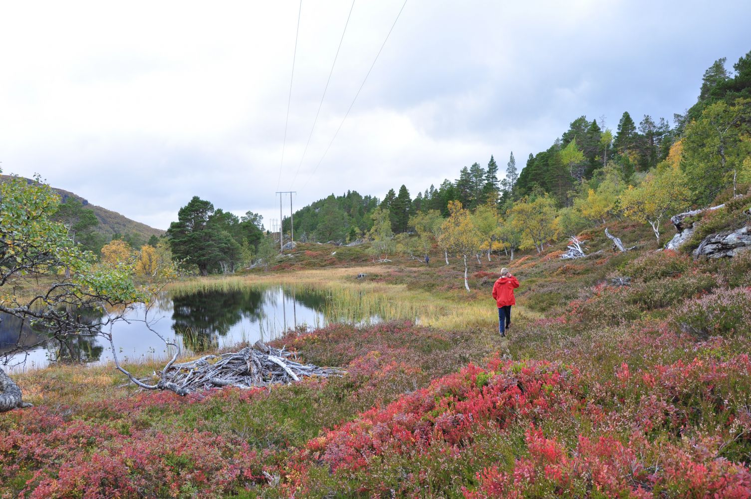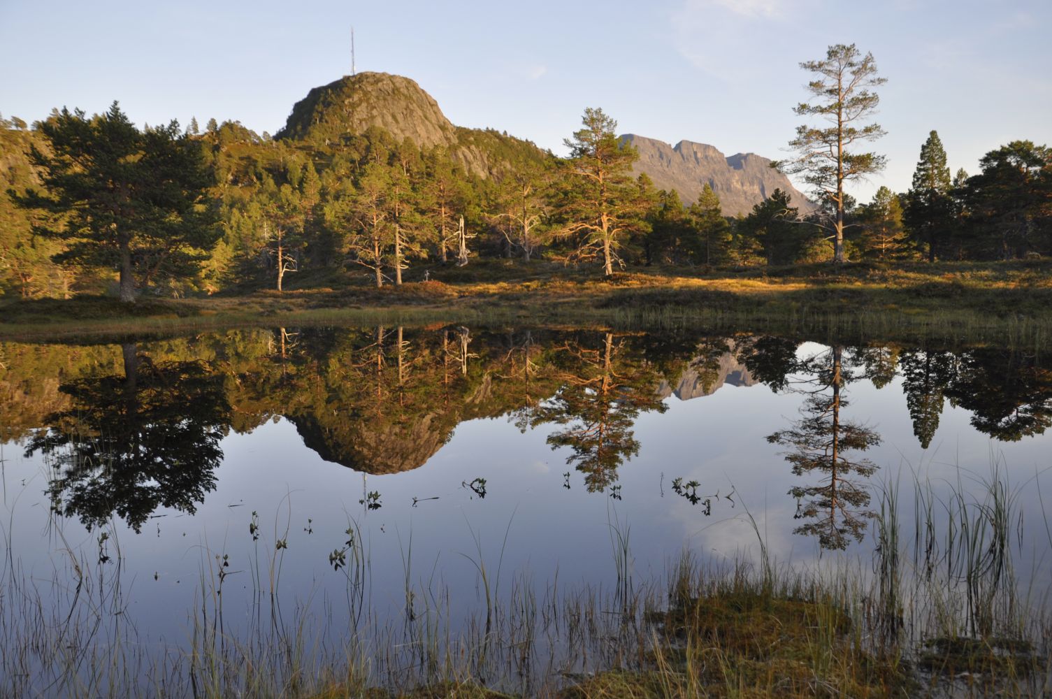 No er det unnabakke nokre hundre meter, og du går langs ein rygg på fine berg og har flott utsyn mot fjorden. Stien svingar ned mot myrtjørnene og endar ved ein turpost nordvest på Flåna-området.