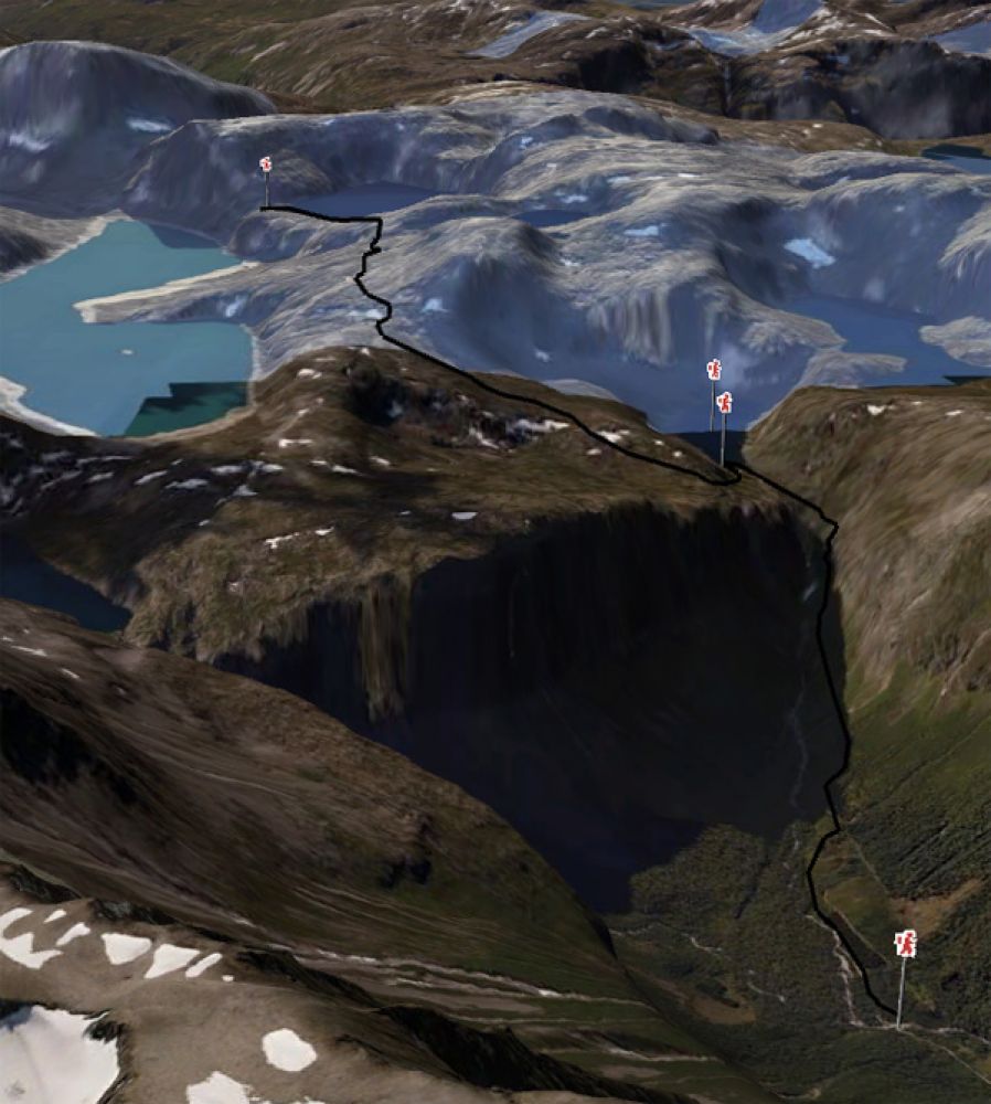 Før skoggrensen går stien bratt oppover langs en rygg. Etter skoggrensen er stien tydelig der den krysser ura fram mot elva, der det blir bratt. Det bratte partiet er godt merket, og sikret med kjetting og wire. Der er luftig ca. 300 meter, før terrenget legger seg og stien krysser oppover ura til toppen av skaret.