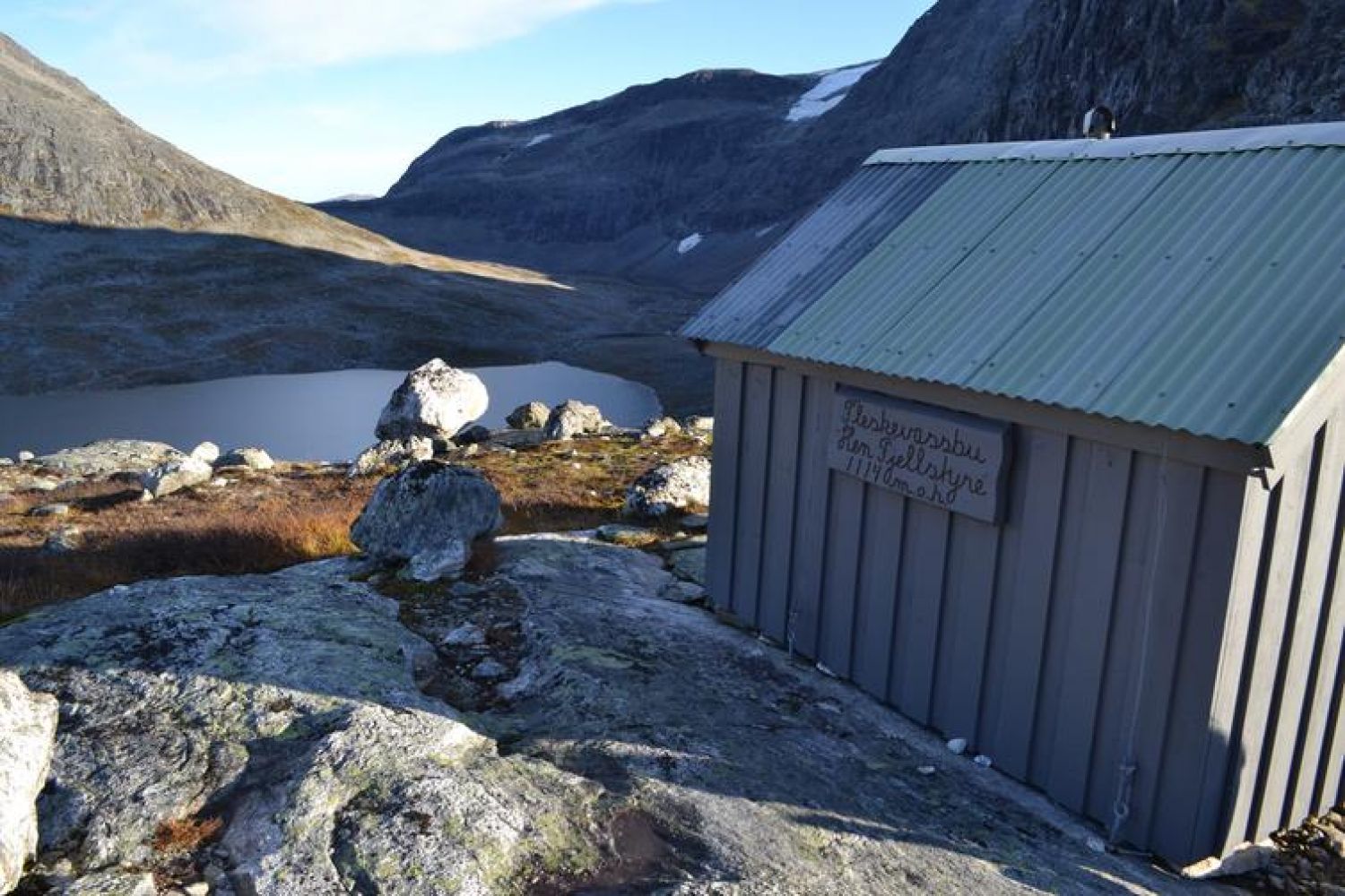 Saufonnhytta og vatnet ligger like innenfor der terrenget legger seg, på andre siden av elva.