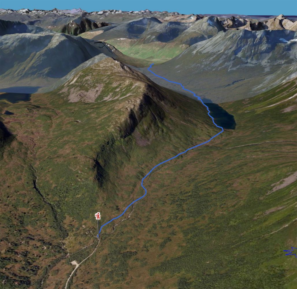 Følg venstrekanten av vatnet på god sti videre innover, periodevis langs vannkanten. Etter vatnet kryss elva og videre et stykke før ny elv (som kan av og til kan være stor). Etter elva går stien slakt innover, og krysser små