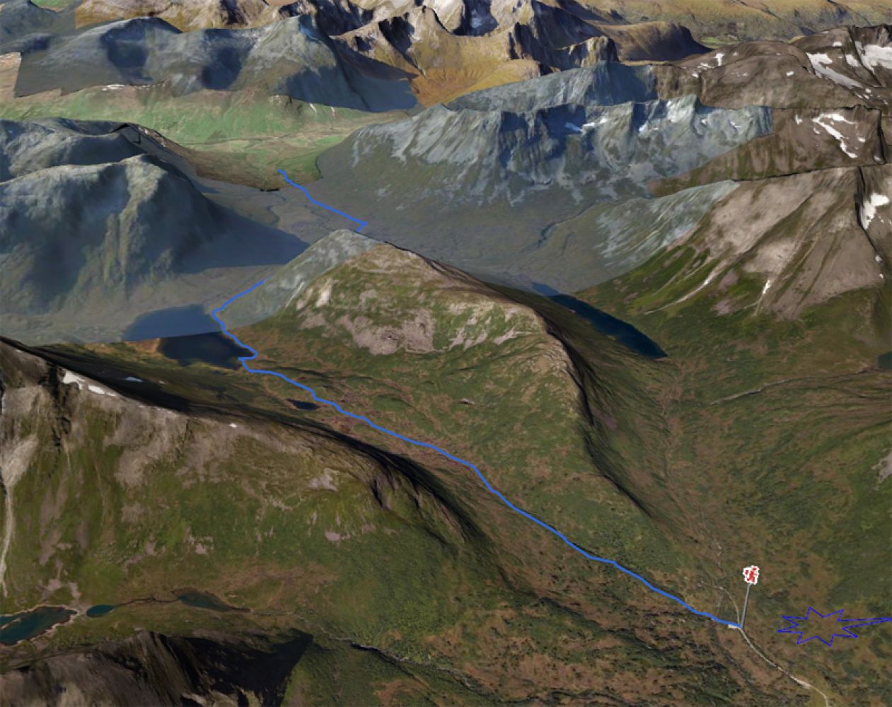 Fortsett på dårligere sti langs vatnet på høyresiden (nordsida) til naustet under Storvasshytta og deretter opp til Storvasshytta. Følg deretter sti som runder foten av Kamben, over myrer i høyrekanten av dalen ned til Kambemyrane.
