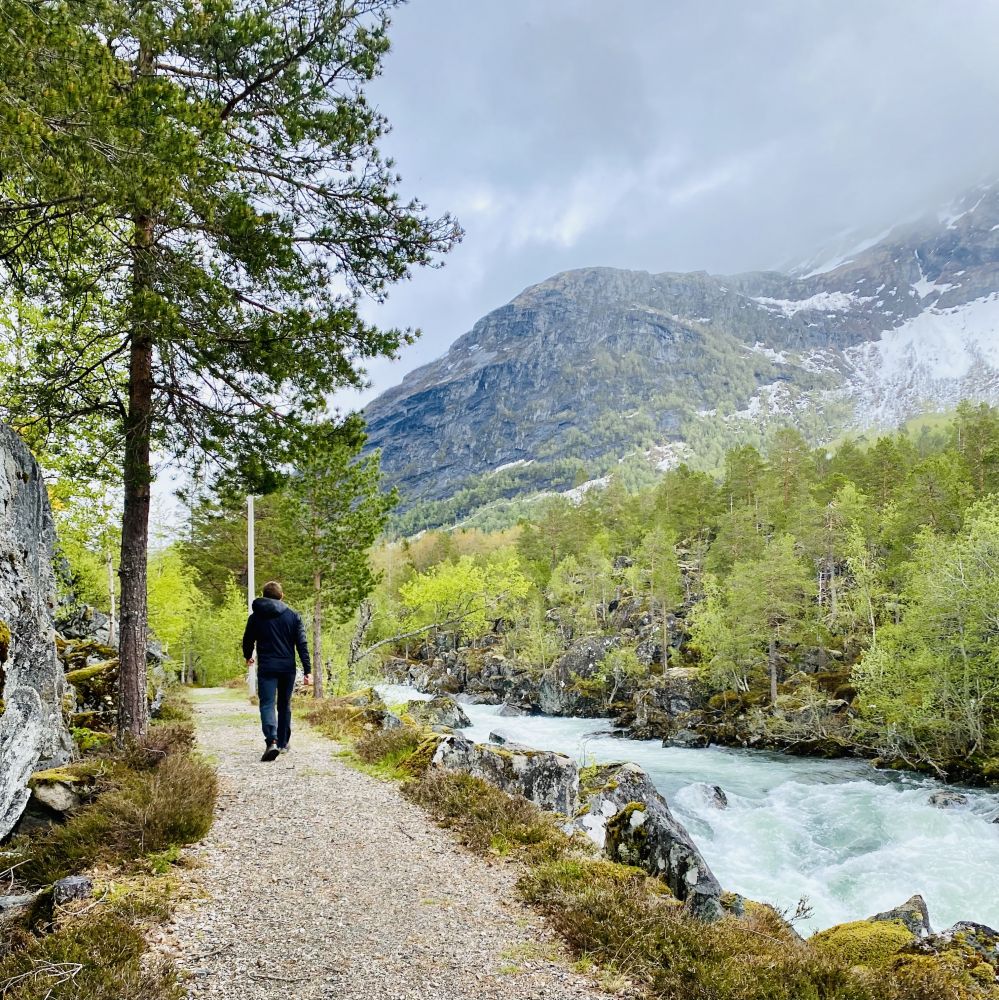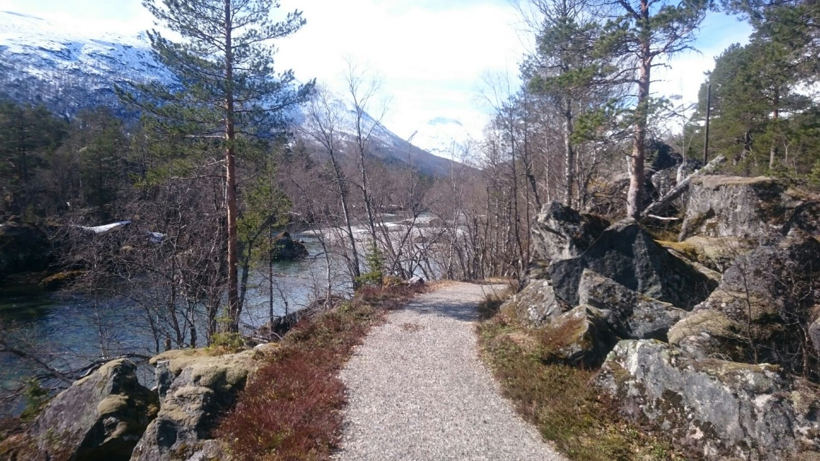 Ein enkel og fin tur på lett kupert grusveg mellom Alstad og Grønning. Passar for alle aldersgrupper. Turen går langs elva Valldøla og undervegs er det mange fine stoppunkt og fotopunkt med utsyn til elva som kastar seg nedover med fossebrøl og til fjella ikring.