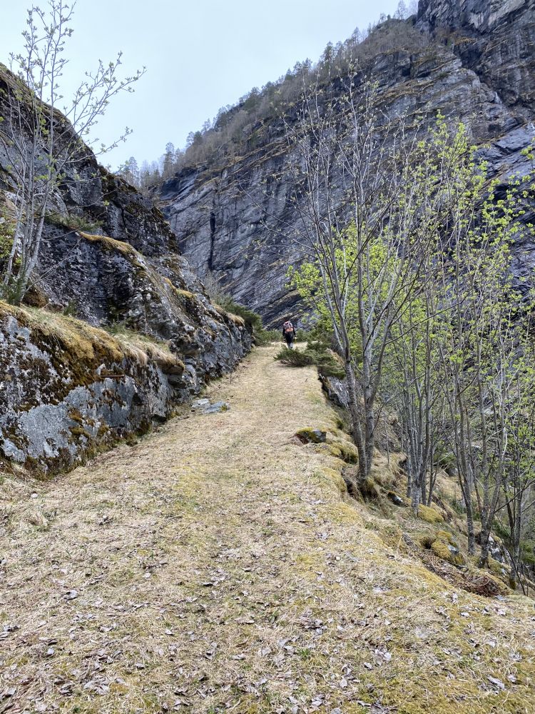 Stien går ned skråninga på nedsida av bilvegen, kryssar elva på god bru og følgjer gamlevegen på austsida av det smale dalføret. Vegen er fint oppmura og går først i svingar oppover, før terrenget flatar meir ut gjennom skogen. Dette er den gamle vegen frå Tafjord og oppover Rødalen. Vegen er fin å gå for alle, men om du har med barn så ver merksam på nokre få punkt med bratte stup mot elva. Den nye vegen (bilvegen) går på andre sida av dalen.