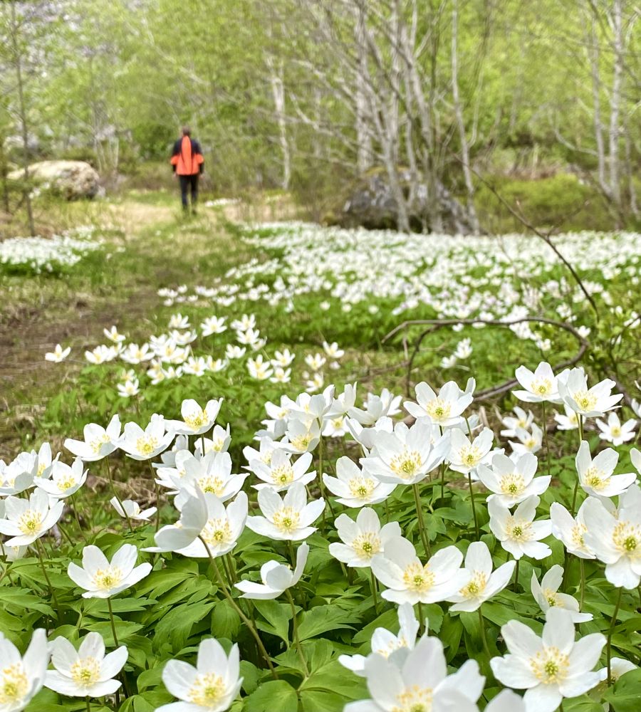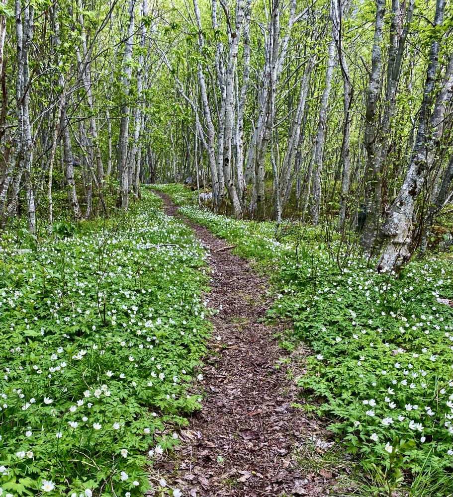 Det er spesielt fint å gå denne turen i starten av sesongen, med kvitveis langs stien og nyutspretta lauv på trea.
