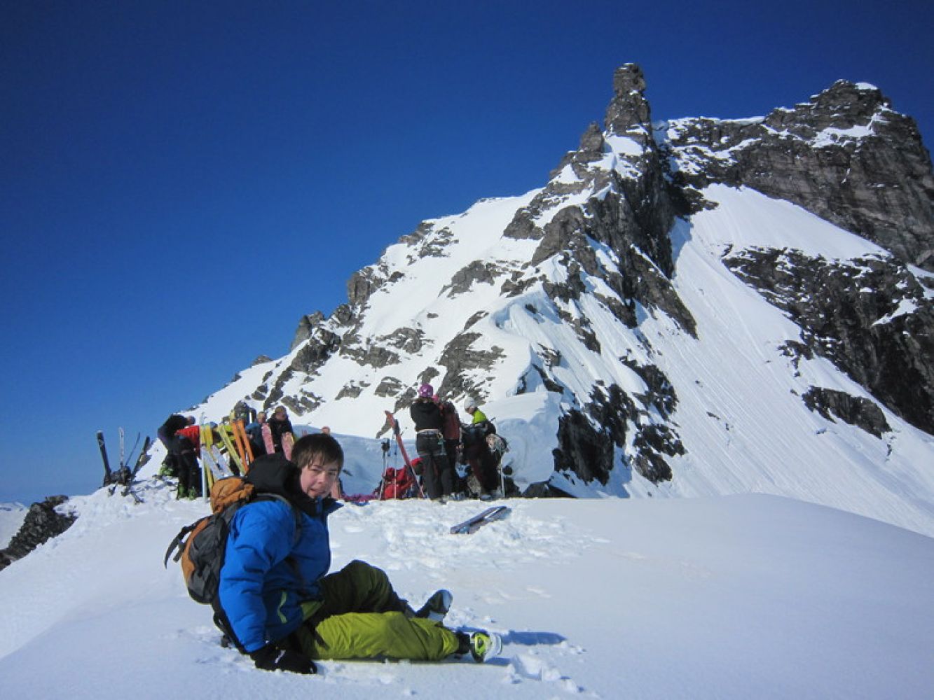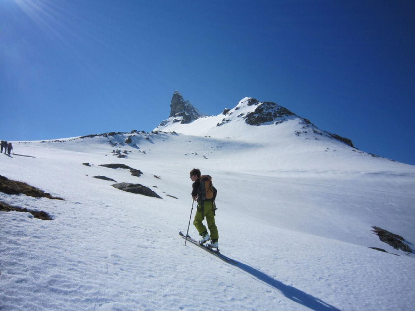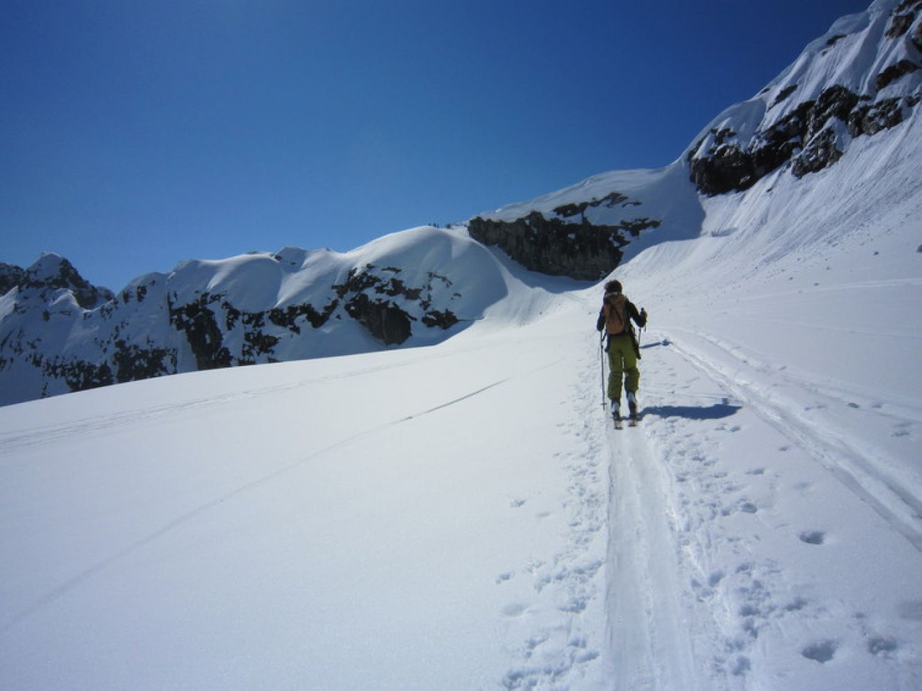 Etter det flate partiet kommer et kort bratt parti som leder opp til en ny stor flate. Etter denne flaten kommer det lengste og bratteste partiet. Kryss først litt til venstre og deretter mot venstre til det legger seg. Fortsett mot høyrekanten av skaret og slakere terreng. Like før skaret ta av opp til høyre og rund selve toppen mot øst ved å krysse helt i overkanten av breen.