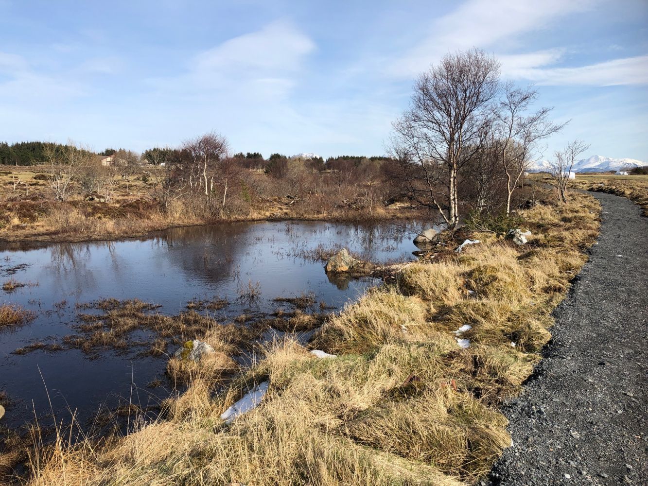 Den grusa turstien er lett å følge. Ein følger først flystripa, passerer nokre små myrdammar og kjem etter kvart inn i meir vegetasjon. På slutten av turstien kjem ein til eit høgdedrag, der ein får fin utsikt mot Rødabukta og Røssøyvågen. Det er fleire benkar langs turstien
