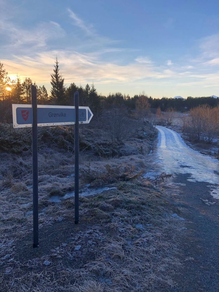 Start turen videre langs fylkesveien der hvor gangveien slutter. 150 m lenger fram står skiltet til Grønvika. Da er det bare å følge veien. Ikke gå helt fram til de første husa, men sving til venstre der og gå langs veien som leder til hytta.