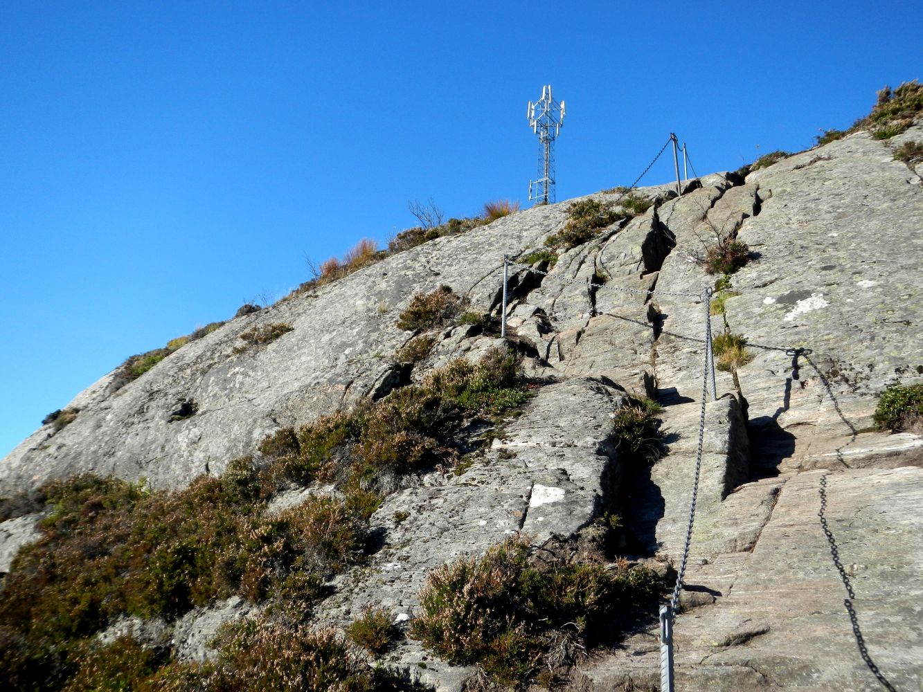 Tar du til venstre kommer du rett opp til post 6 og masta med StikkUT-posten. Opp siste biten til masta er det svaberg med en kjetting å holde seg i. Vær litt forsiktig her, spesielt i vått vær. Vi har valgt "blå" farge på turen, nettopp pga. dette stedet. Vi håper jo så klart at du vil ta hele runden når du først har kommet deg opp til stiskillet. Dette er en flott trimrunde med super utsikt!