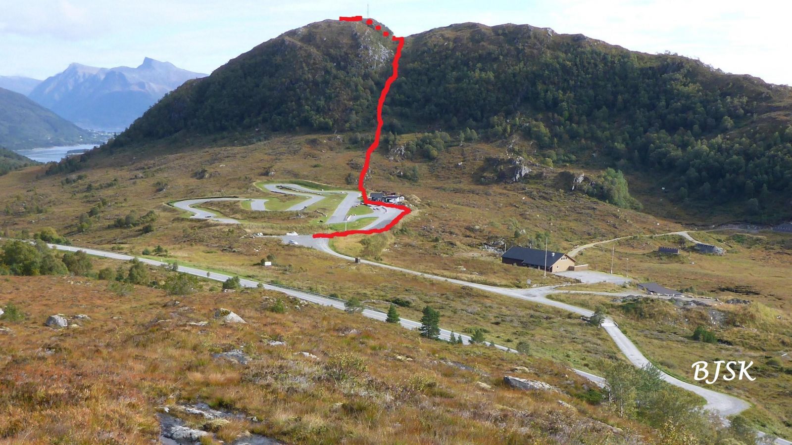 Frå parkeringsplassen går du på sørsida langs gocartbana ca 200m. Råsa startar i første svingen etter at du har passert verkstadbygget på Gocartbana. Råsa går då rett mot aust opp skaret på sørvestsida av toppen. Når du er komen opp skaret går råsa over myra og mot nord opp forbi mobilmasta som står på sørsida av toppen.