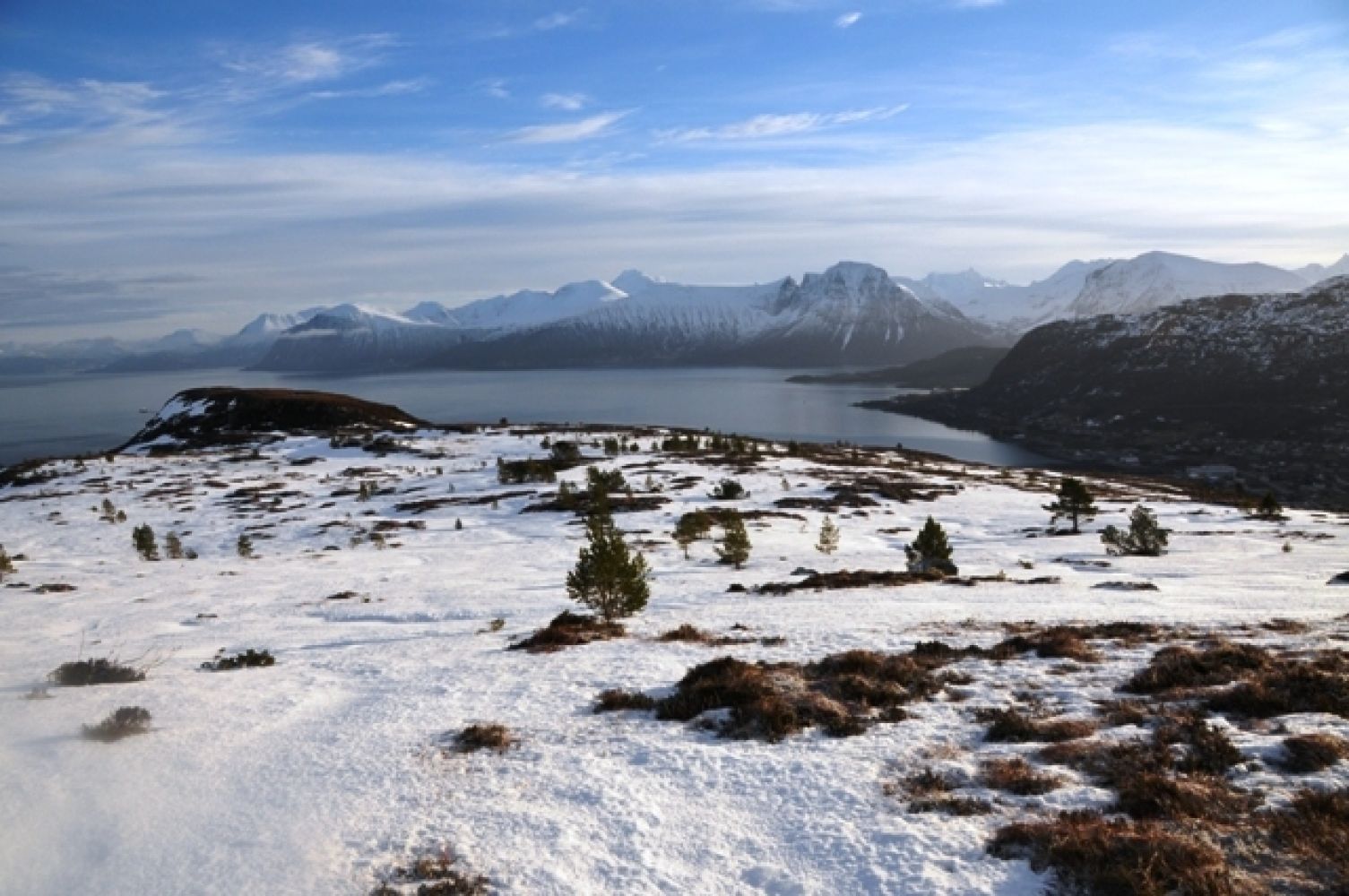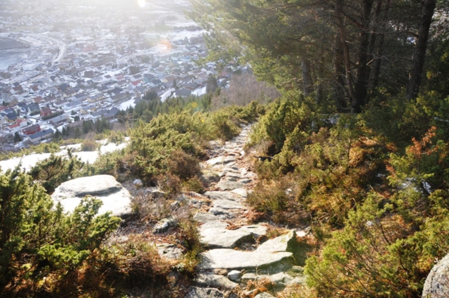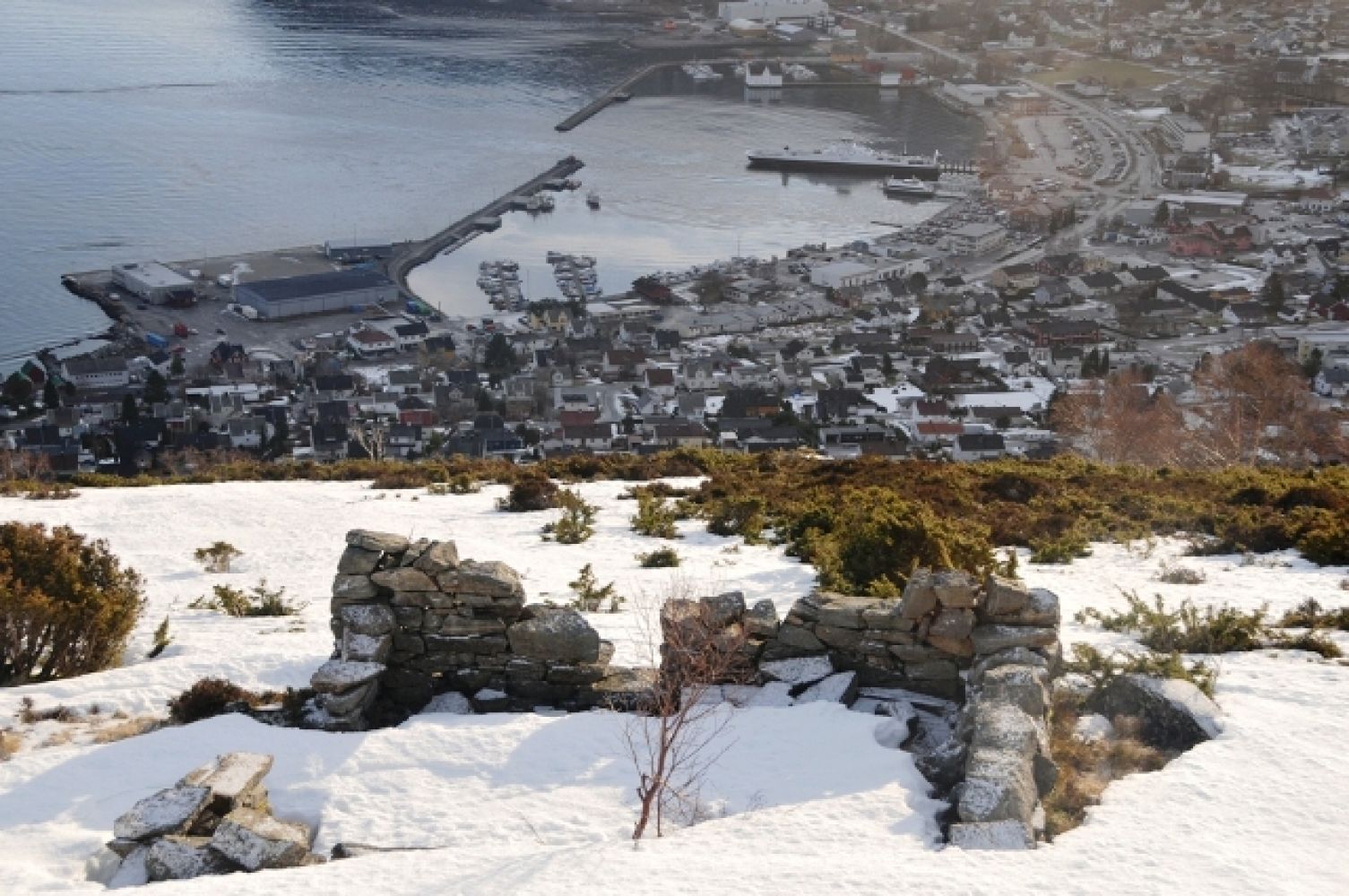 Dei som kjem over fjorden frå nord treng ikkje ta med bil over, men kan bere skiene frå hamneområdet til starten av ”Køyrevegen”, som fører opp på fjellkanten. Den ubrøytte ”Køyrevegen” (med steingard på begge sider) går frå øvst i Hovlid - først i ei sløyfe mot høgre før han svingar mot venstre ved den store, flate kvilesteinen ”Merkarsteinen”. Like etter større snøfall kan der vere utfordrande å gå. Men etter ei tids bruk er han gjerne litt oppgått. Vegen er heller ikkje brattare enn at han er gåande med fellar på skiene. Men dei fleste tek på skiene ved Merkarsteinen – eller litt ovanfor. Frå Merkarsteinen er ”Køyrevegen” gjerne meir tildekt av snø, men viser seg likevel som ei grop i fjellsida. Like før vegen flatar ut ligg grunnmuren av den gamle ”Sommarfjøsen” ned til venstre. Her er det god utsikt mot sentrumsbygda og fjellheimen i sør. Mange rastar i ruinane. Treverket fauk av garde med nyttårsorkanen i 1992. På ettervinteren og ved påsketider er den soleksponerte delen av Køyrevegen ofte berr. I denne tida er det også ofte skareføre i høgda.Frå fjellkanten gir vegen til topps seg sjølv, oppgådde løyper eller ikkje.