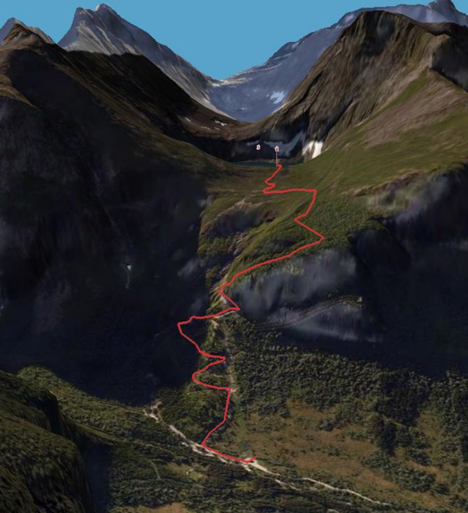 fra bakken. Ta til høyre opp en bratt sti. Stien krysser først oppover før den går til venstre og runder inn i Haugabotn på høyde med inntaksdammen til kraftverket. Fortsett slakt innover botnen opp til Haugabotsvatnet.