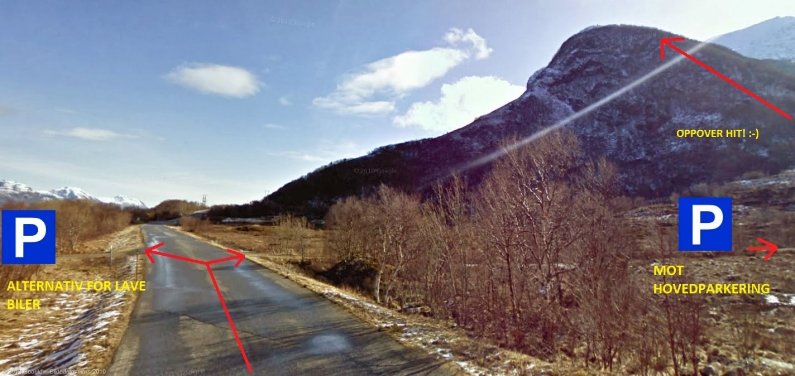 Køyr Fv 659 mot Brattvåg, og ta av til høgre mot Hellandshamn på veg nr 5966. Etter bebyggelse kjem ein lang venstresving, og du passerer ein fabrikk på høgresida. Avkøyring til parkeringsplassen ligg i neste kryss (sjå bilde). Det er også er par parkeringsplassar langs vegen (ved krysset).