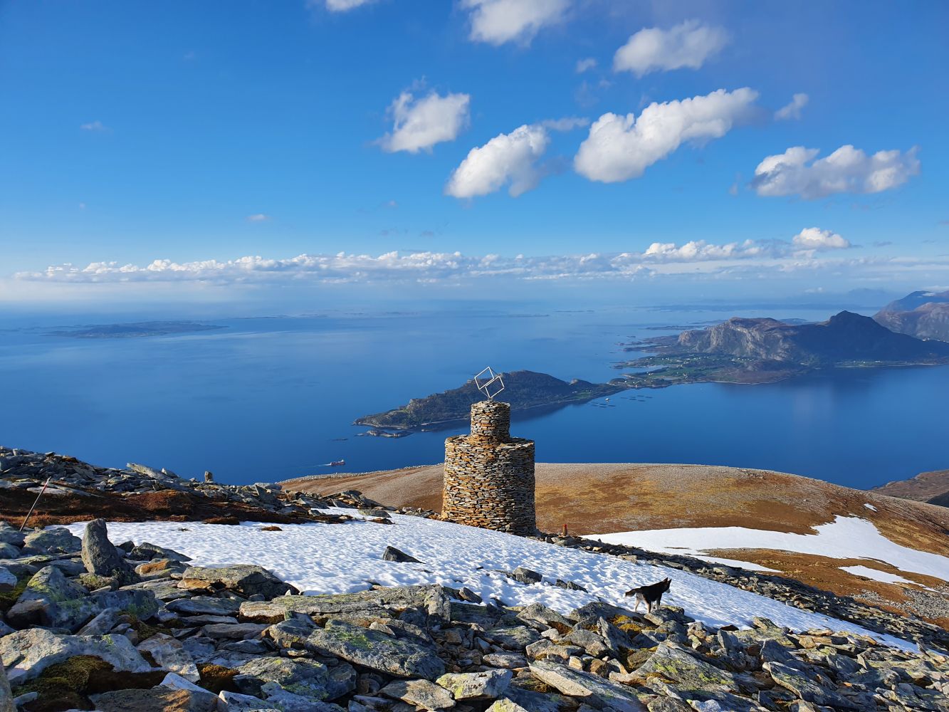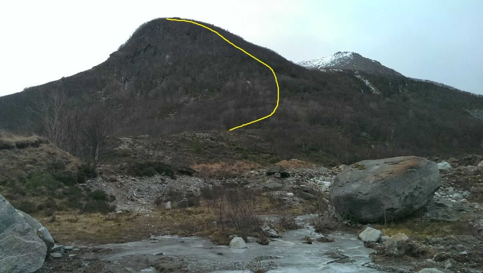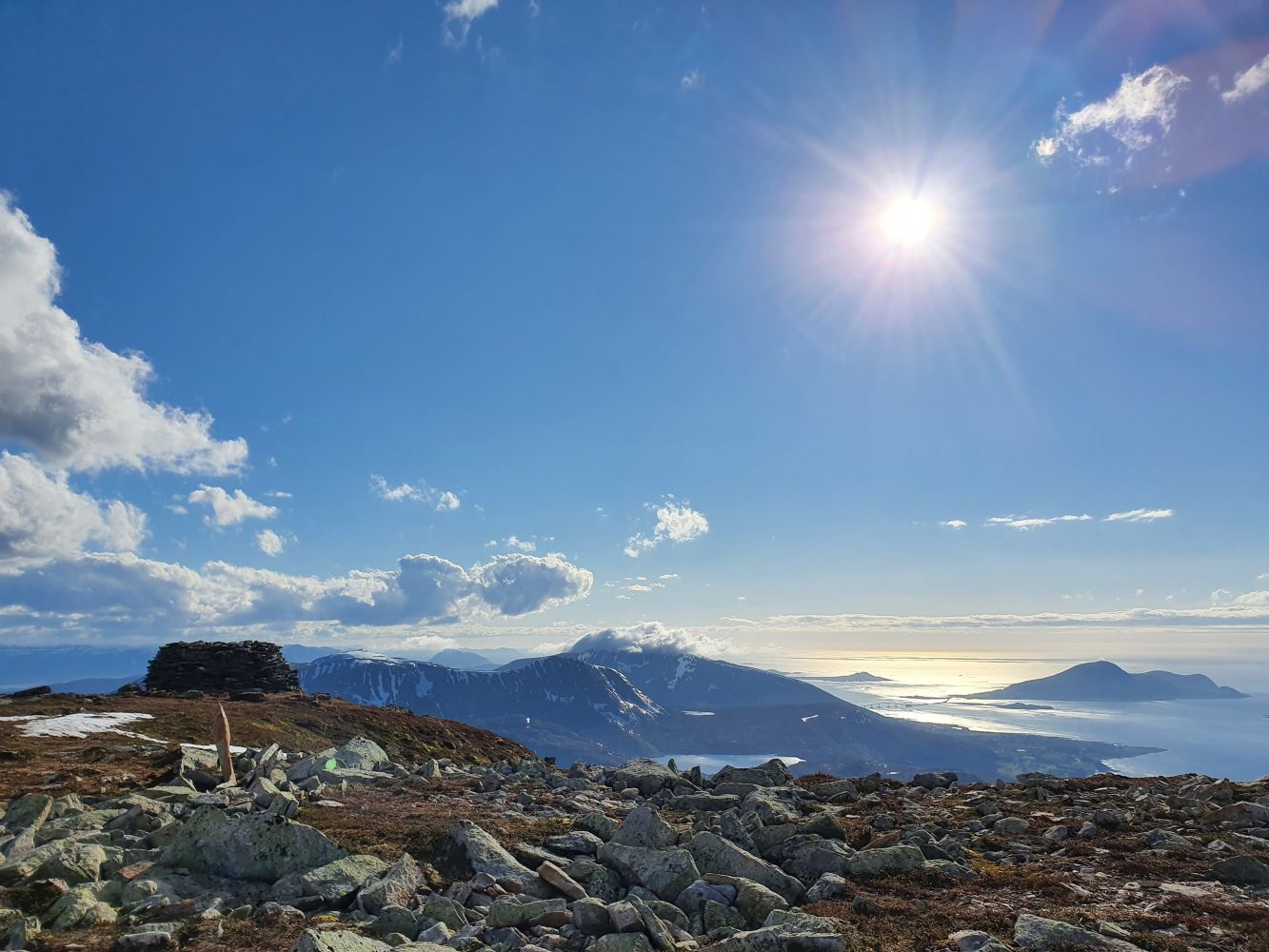 Når du kjem over dette stykket, har du utsikt heile vegen, og kan sjå opp mot sjølve fjellet. Følg den tydelege stien vidare på småstein, lyng og mose. Den siste delen opp mot sjølve toppen er steinur og litt brattare. Midt oppe i ura er det reist ein kjempevarde som ein skal passere. Oppe på toppen kjem ei lita improvisert hytte med pipe på høgre sida, og toppvarden følgjer like etter. Det høgaste punktet ligg ikkje ved varden, men knapt 2-3 minutt lengre sør.