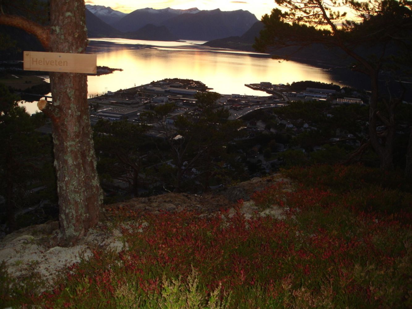 Start på samme sted som stien til Nebba og Aksla/Romsdalseggen. Ta av ved sti som går til Vikåa (skiltet), og følg denne 500-600m til nytt skilt (Nebba). På denne strekninga er det satt opp en benk med fin utsikt mot Åndalsnes sentrum og gondolbana(?!). Når en kommer til en rest av et gammelt skitrekk/slalåmløype, går stien i motsatt retning over Nebbaryggen mot Bjørmosen/Helveten. Denne stien er nymerket. På sørsida av ryggen går stien omtrent i samme høyde. Etter nye 500-600 m. kommer en til et stikryss. Stien opp til venstre er skiltet (Helveten), og går under en bratt hammer. Gå først under hammeren til høyre (kjetting), og så opp en rampe til venstre (kjetting). Rund hammeren ut på ei hylle, og deretter et bratt opptak (kjetting). Dette leder opp til Helveten, som er et lite platå med flott utsikt. Her finner du turkasse med kode for Stikk UT!-registrering. Stien fortsetter videre oppover og gjennom ei ur. Etter ura er det et kort, bratt stykke opp, før en går til venstre mot stien fra Aksla. Like før en møter stien fra Aksla er det et flott utkikkspunkt til venstre (Bjørnefallet). Fortsett så til stien nedover fra Aksla, og følg denne til utgangspunktet.