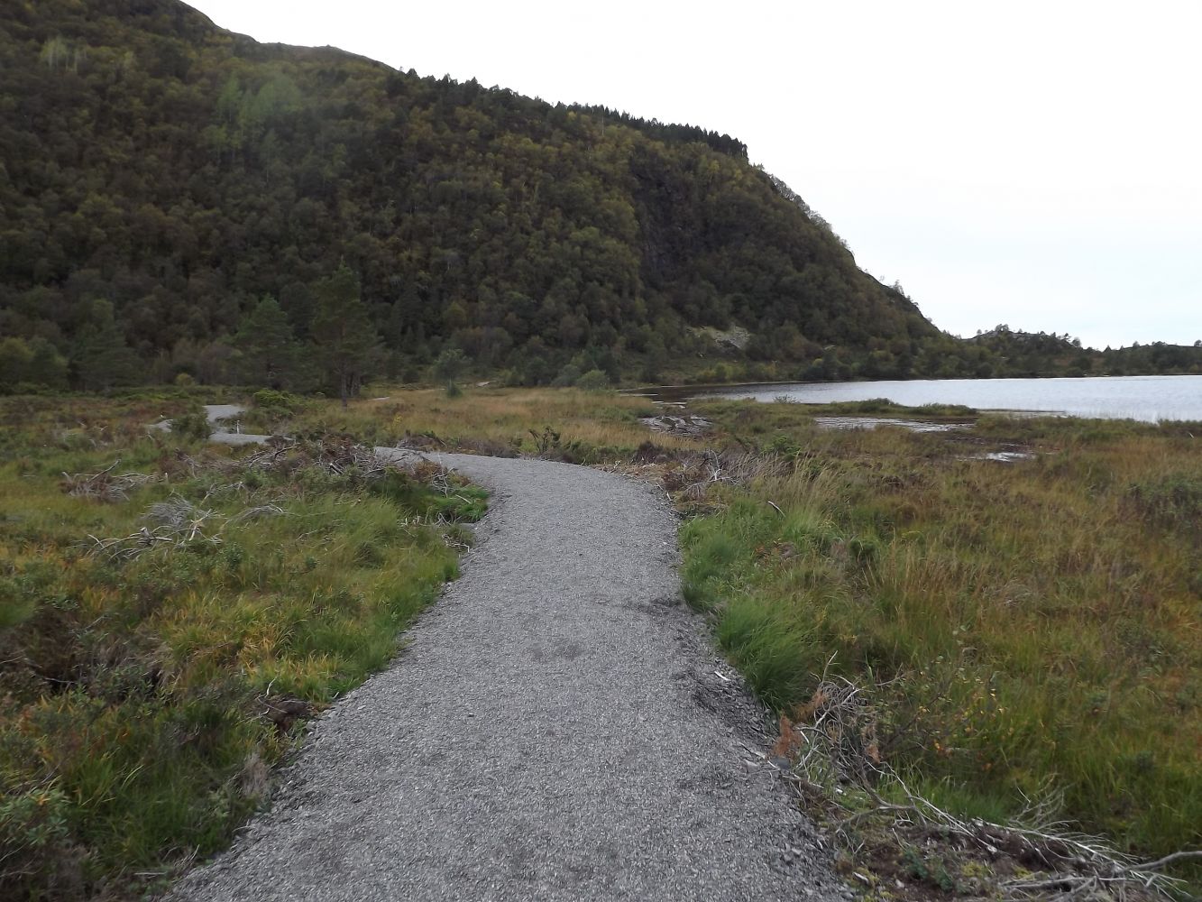 Turen rundt er på 2,4 km og den er universell utforma og ein kan godt kome seg rundt med rullestol eller barnevogn.