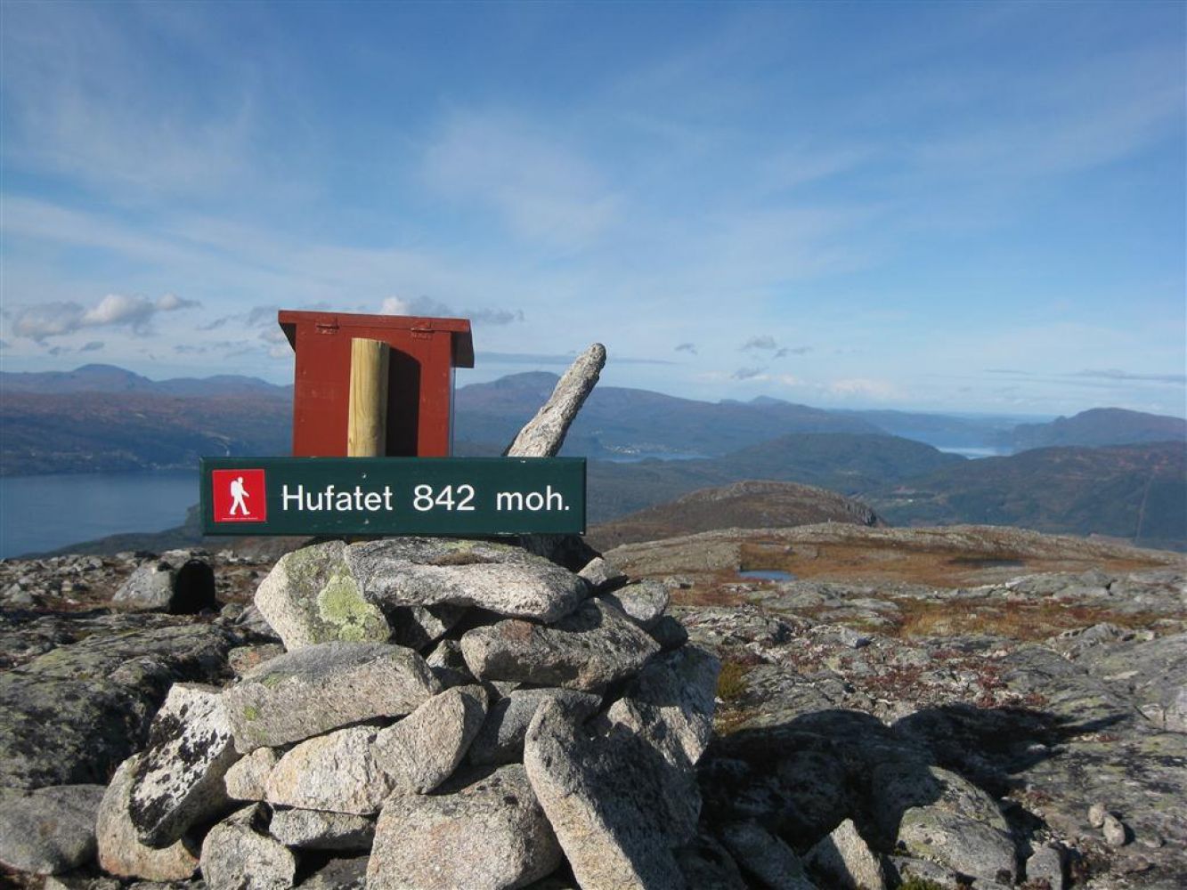 Fantastisk natur, med god utsikt over flotte fjorder og fjell i nærområdet. Varde med rød Stikk UT!-postkasse på toppen.