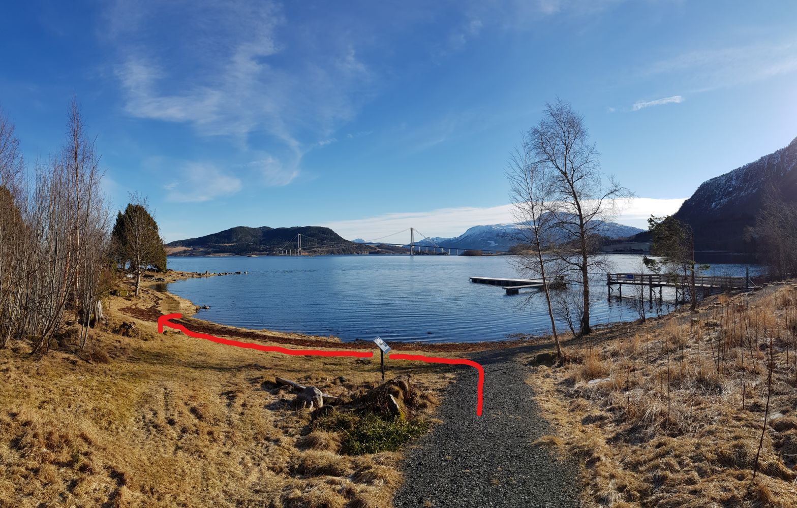 Sjølv om dette er ein kort tur, er det stor variasjon i type terreng. Stien blir ikke brøytet. Turen startar like til venstre for toalettet ved parkeringa. Herifrå er det om lag 200 meter med grusa turveg før du skal ta av til venstre langs strandkanten. Etter om lag 150 meter langs sjøkanten kjem du til turmålet. Her er det fint å tenne bål og å rast. Hugs å ta med avfall tilbake.