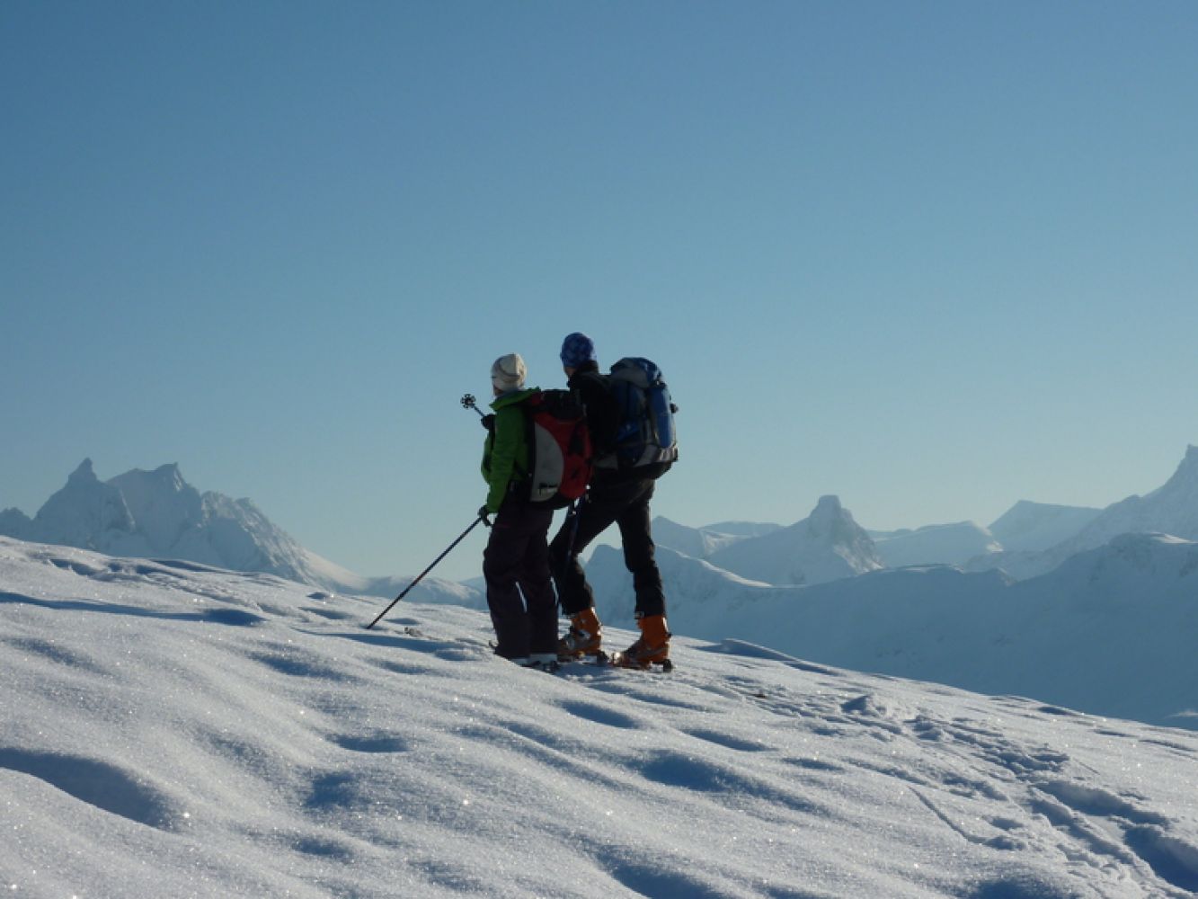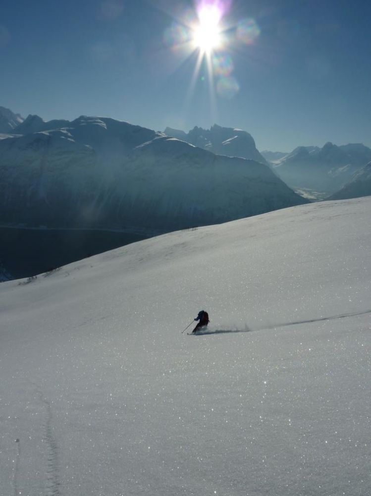 Herfra er det flott nedkjøring på sydøst sida ned til Breiviksetra. Kryss over dalen (forbi Høyspentlina) og opp igjen en kort side til en liten topp, og deretter ryggen og senere botnen til kanten mot Ljøsådalen. Herfra følges ryggen videre oppover, forbi flere fortopper til Snortungen.